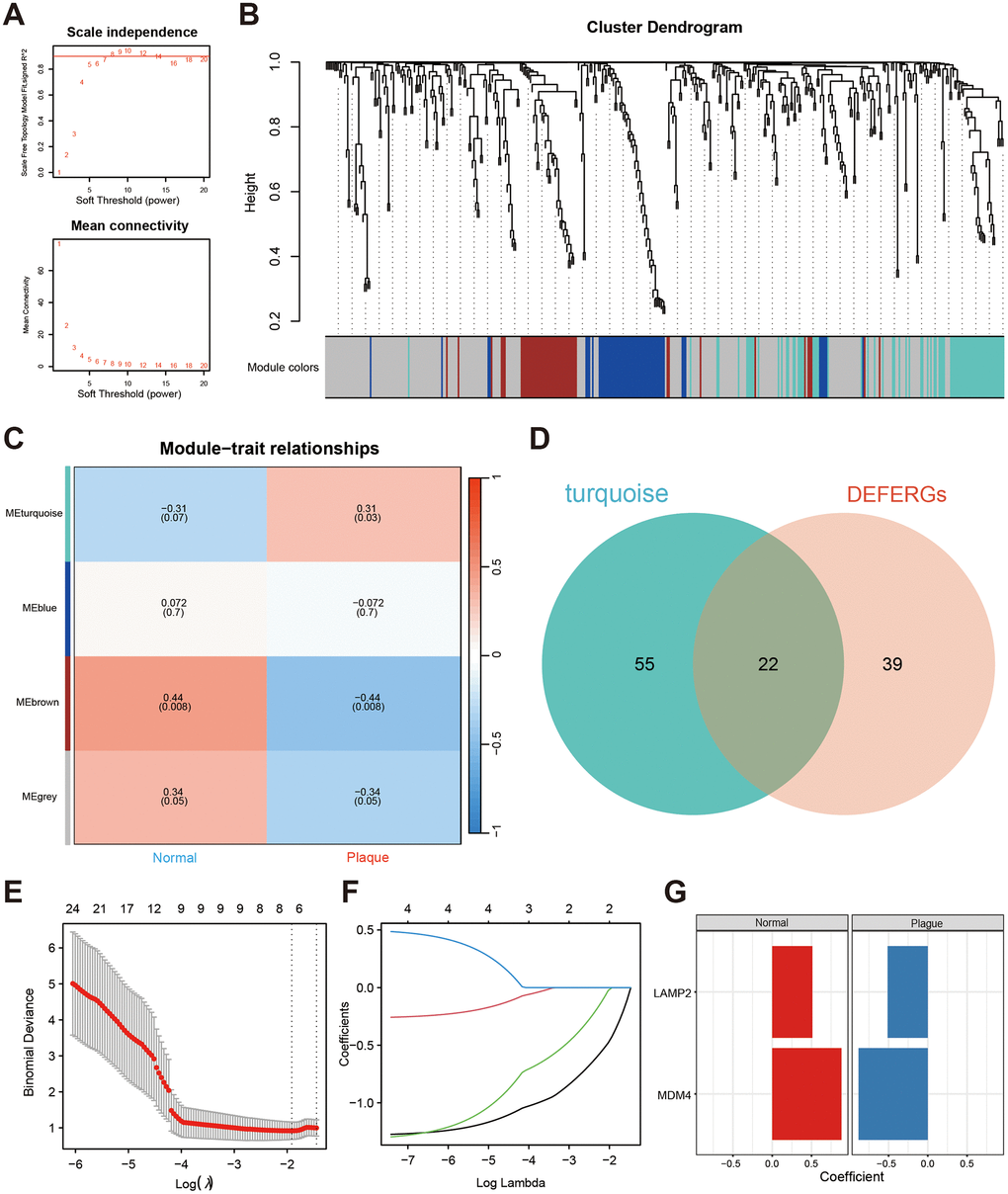 To screen the hub DEFERGs, a machine learning algorithm was employed. Specifically, the least absolute shrinkage and selection operator (LASSO) regression approach was utilized with “glmnet” R package. Through the LASSO analysis, two DEFERGs were identified as the hub DEFERGs based on their importance and contribution to the model. To assess the discriminatory capacity of the two hub DEFERGs in distinguishing between Plaque group and Normal group, a receiver operating characteristic (ROC) curve was built to discriminate between these groups.