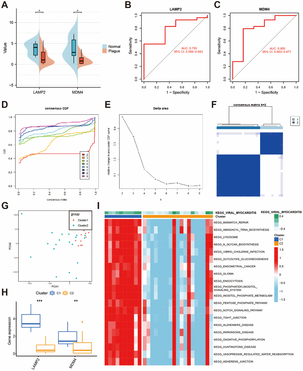 The consensus clustering analysis of the expression profiles of LAMP2 and MDM4 revealed two distinct subtypes of CaOx nephrolithiasis. The stability of the clustering results was confirmed by the CDF curve (Figure 3D) and the CDF Delta area curve (Figure 3E). The consensus matrix plot showed that Plaque group could be divided into two clusters, namely cluster 1 (n = 10) and cluster 2 (n = 19) (Figure 3F). The detailed clusters based on the hub DEFERGs were shown in Supplementary Table 6. The PCA plot further demonstrated a clear distinction between the two clusters (Figure 3G). Additionally, the boxplot indicated that cluster 1 had higher expression of LAMP2 and MDM4 than cluster 2 (Figure 3H). As shown in Figure 3I, GSVA results revealed that cluster 1 was enriched in lipid metabolism, amino acid metabolism, bile acid metabolism, kidney metabolism, signal transduction, cell junctions, and immune response, which exert a major influence on CaOx nephrolithiasis.