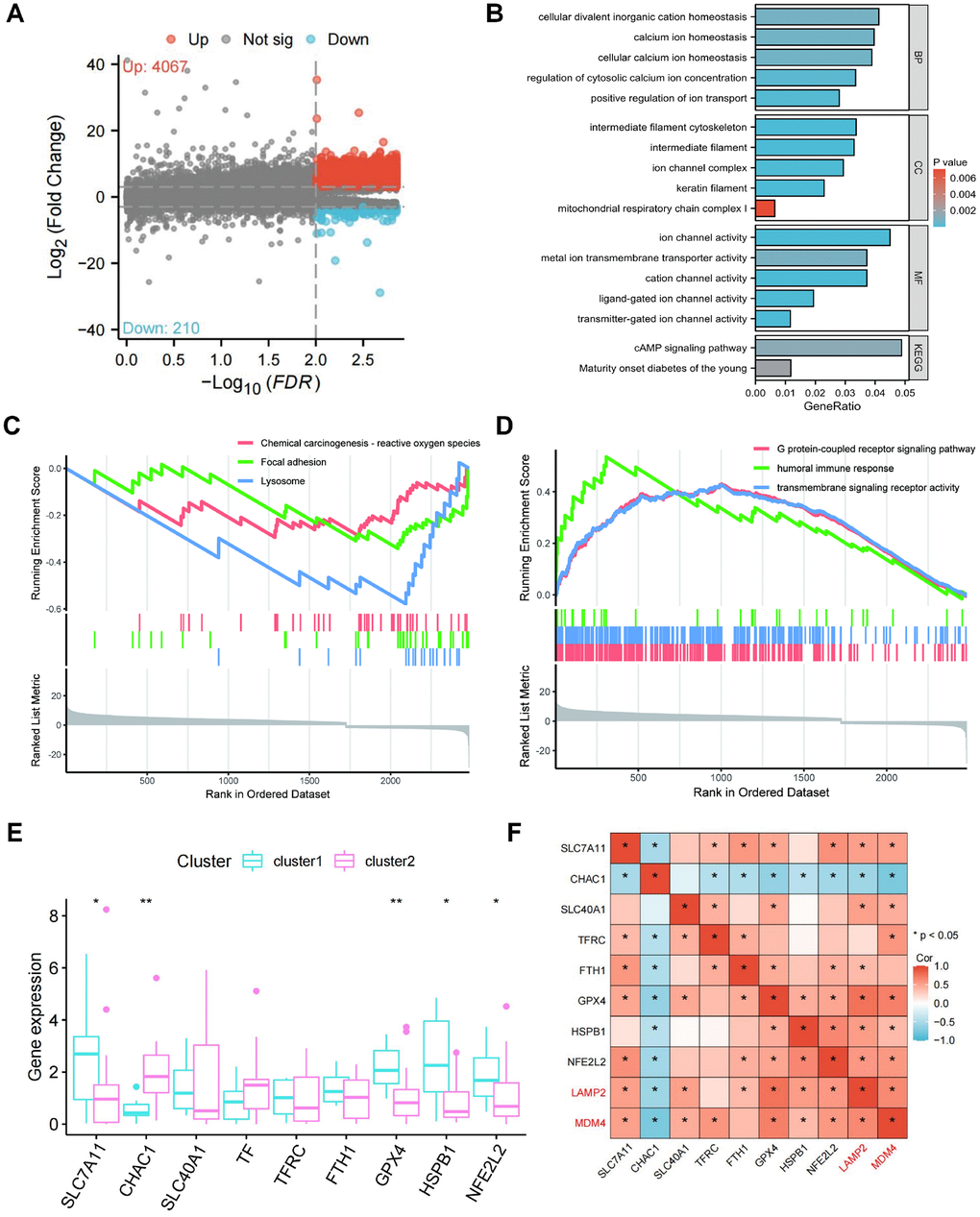 A total of 4277 differentially expressed genes (DEGs) were identified between clusters (Supplementary Table 7). Compared to cluster 1, 4067 DEGs were upregulated and 210 DEGs were downregulated in cluster 2 (Figure 4A). G protein-coupled receptor signaling pathway, transmembrane signaling receptor activity, and humoral immune response were enriched in GO terms (Figure 4B). Lysosome, Focal adhesion, and Chemical carcinogenesis-reactive oxygen species were enriched in KEGG pathways (Figure 4C). As shown in Figure 4D, the GO analysis results, positive regulation of ion transport, regulation of cytosolic calcium ion concentration, cellular calcium ion homeostasis, calcium ion homeostasis, and cellular divalent inorganic cation homeostasis were significantly enriched in biological processes (BP); keratin filament, intermediate filament, intermediate filament cytoskeleton, ion channel complex, and mitochondrial respiratory chain complex I were significant involved in cellular components (CC); ion channel activity, cation channel activity, transmitter-gated ion channel activity, ligand-gated ion channel activity, and metal ion transmembrane transporter activity were significant included in molecular functions (MF). KEGG analysis demonstrated that the DEGs were enriched in cAMP signaling pathway, and Maturity onset diabetes of the young. These results suggest that the DEGs mainly participate in ion transport such as iron and calcium, which is closely related to ferroptosis and CaOx nephrolithiasis.