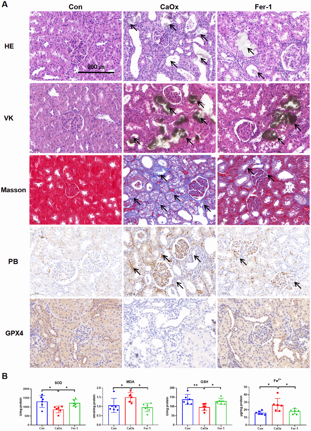 Male Sprague-Dawley rats aged 5-6 weeks were divided equally with n = 6 into three groups: the control group, the CaOx group, and the ferrostatin-1 (Fer-1) group. The control group had access to water ad libitum, while the CaOx group received 1% ethylene glycol (EG) in their drinking water. The Fer-1 group was treated with 1% EG in their drinking water and received an additional gavage administration of 0.25 mg/kg/d of Fer-1. Fer-1 was initially dissolved in dimethyl sulfoxide (DMSO) and then further diluted with 0.9% NaCl solution. The resulting solution had a final concentration of 0.25 mg/ml for Fer-1 and 0.1% for DMSO, which was administered via gavage to the Fer-1 group. Meanwhile, the control group and the CaOx group were gavaged with equal volumes of 0.9% NaCl solution containing 0.1% DMSO. After four weeks, blood plasma and renal tissues were collected for further analysis.