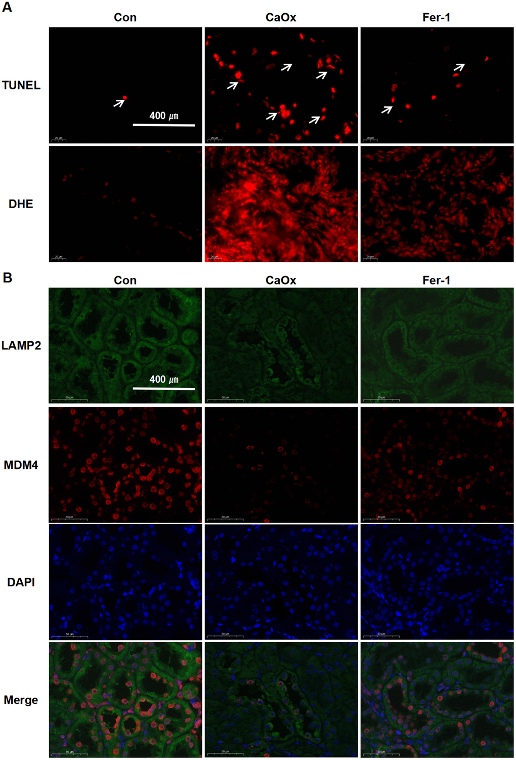 TUNEL assay revealed that the apoptotic nuclear changes were markedly greater in the CaOx group than in the control and the Fer-1 group (Figure 6A). DHE fluorescence staining displayed the highest concentrations of intracellular oxidant species in the CaOx group (Figure 6A). Double-labelling IF results demonstrated that the protein expression of LAMP2 and MDM4 was attenuated in the CaOx group, which was in agreement with the bioinformatic analysis (Figure 6B). These findings demonstrate that the CaOx nephrolithiasis rat models were established successfully and Fer-1 treatment significantly reduced kidney injury, iron accumulation, and LPO in CaOx nephrolithiasis, suggesting the involvement of ferroptosis, as well as LAMP2 and MDM4 in CaOx nephrolithiasis.