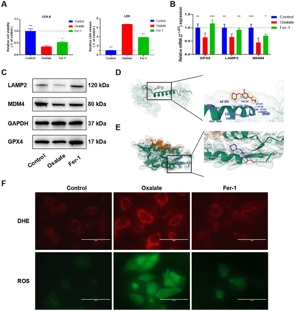The cytoprotective effect of Fer-1 against cell injury induced by oxalate was evaluated using CCK-8 and LDH assays (Figure 7A). Furthermore, qRT-PCR (Figure 7B) and western blot (Figure 7C) analysis demonstrated that the mRNA and protein expressions of LAMP2 and MDM4 were decreased in the oxalate-treated group compared to the control group but were reversed after treatment with Fer-1. The binding energy results of molecular docking of Fer-1 with LAMP2 and MDM4 were -82.44 kcal/mol (LAMP2, Figure 7D), and -5.526 kcal/mol (MDM4, Figure 7E). Next, the DCFH-DA and DHE fluorescence intensity was observed to increase in the oxalate-treated group, but decreased following Fer-1 treatment (Figure 7F).