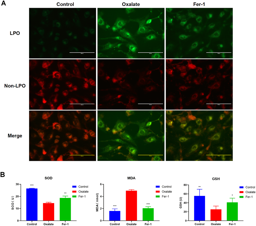 Consistently, the results of LPO probe revealed that HK-2 cells treated with oxalate exhibited significantly elevated LPO level, but was also reduced after Fer-1 treatment (Figure 8A). Similarly, the MDA level was elevated in the oxalate-treated group, but the SOD and GSH levels were reduced. These findings indicate the potential of Fer-1 to protect human renal epithelial cells against oxalate-induced ferroptosis injury (Figure 8B). These data were consistent with bioinformatics screening, strongly suggesting that LAMP2 and MDM4 were potential biomarkers in CaOx nephrolithiasis.