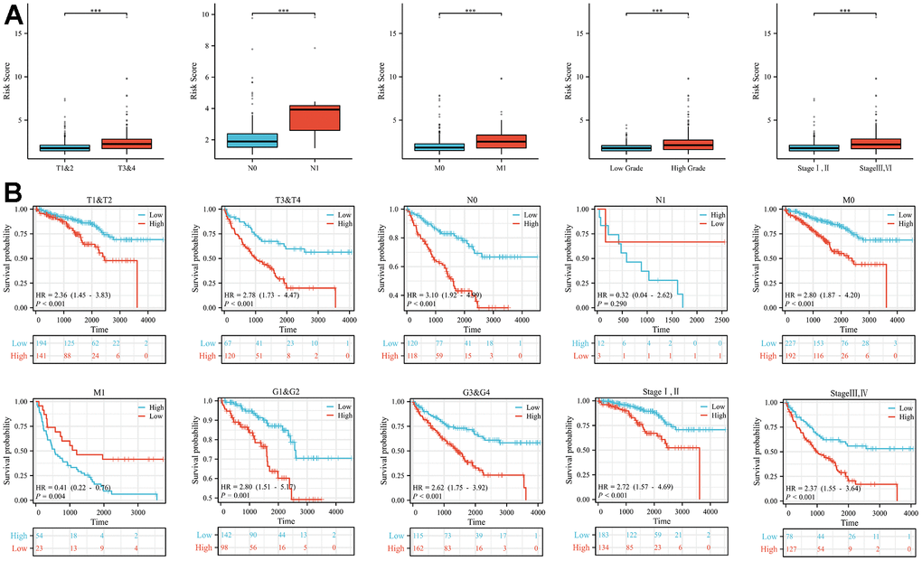 Patients were categorized into different subgroups according to their T, N, M, clinical and pathological stages. The higher the degree of malignancy, the higher the risk score (Figure 2A). And the Kaplan-Meier analysis showed that the overall survival rate of the high-risk group was statistically significantly lower than that of the low-risk group in the different clinical subgroups, with the difference being statistically significant except for patients in the N1 group, where no statistical difference was observed (Figure 2B).