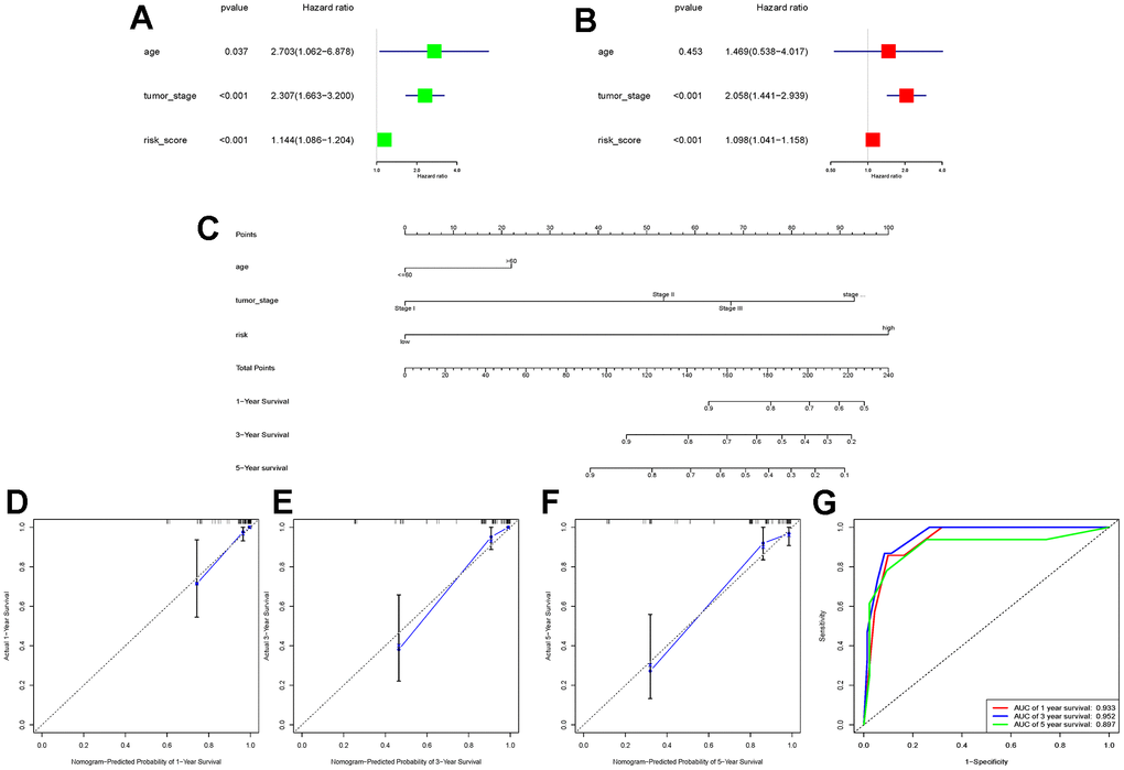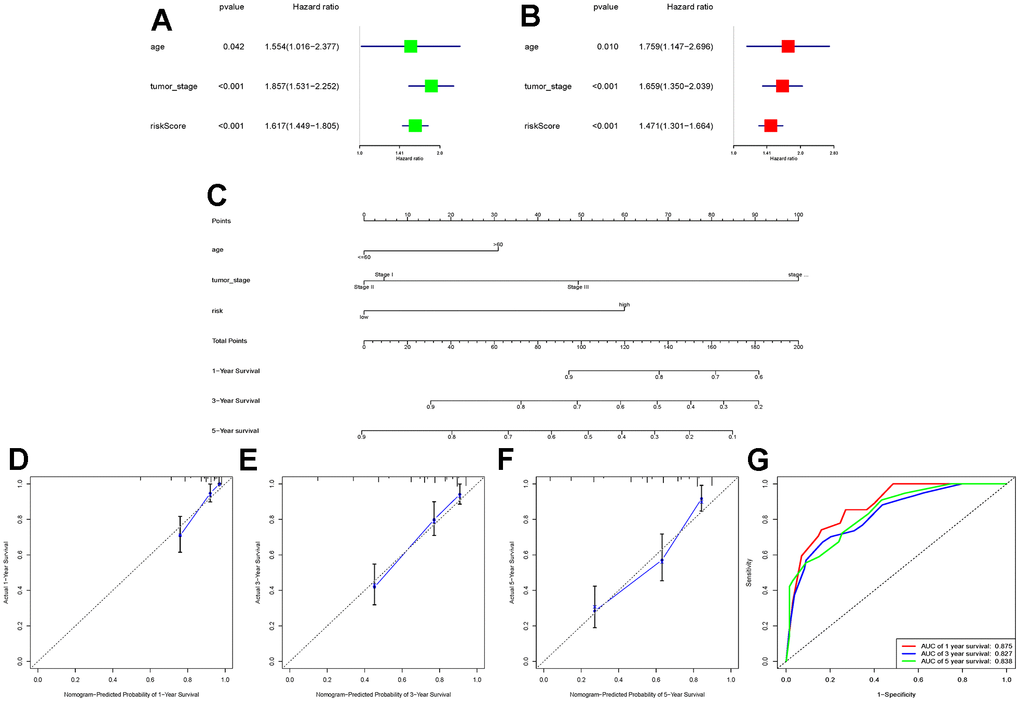 Based on the univariate and multivariate Cox regression analyses, nomogram was constructed using the “rms” package, which included age, tumor stage, and risk group, and had predicted the 1-, 3-, and 5-year survival rates of patients with ccRCC. Calibration charts and ROC curves were further plotted to assess the reliability and accuracy of the plots.