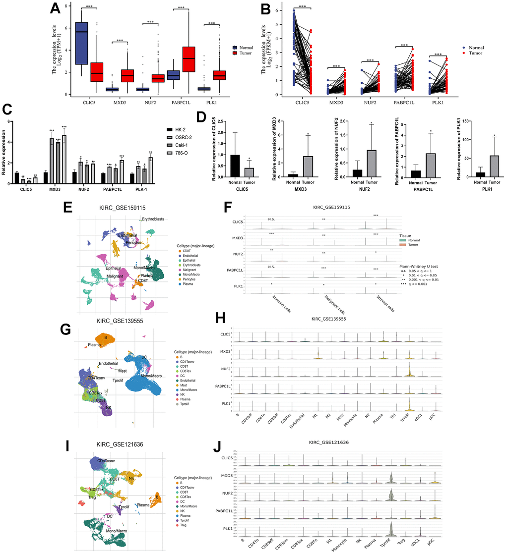 Tumor Immune Single-cell Hub 2 (TISCH2, http://tisch.comp-genomics.org/home/) provides an online database for detailed single-cell analysis. We selected three data (GSE159115, GSE139555, and GSE121636) to analyze the distribution of five key genes (CLIC5, MXD3, NUF2, PABPC1L, and PLK1) in different cell types of ccRCC.