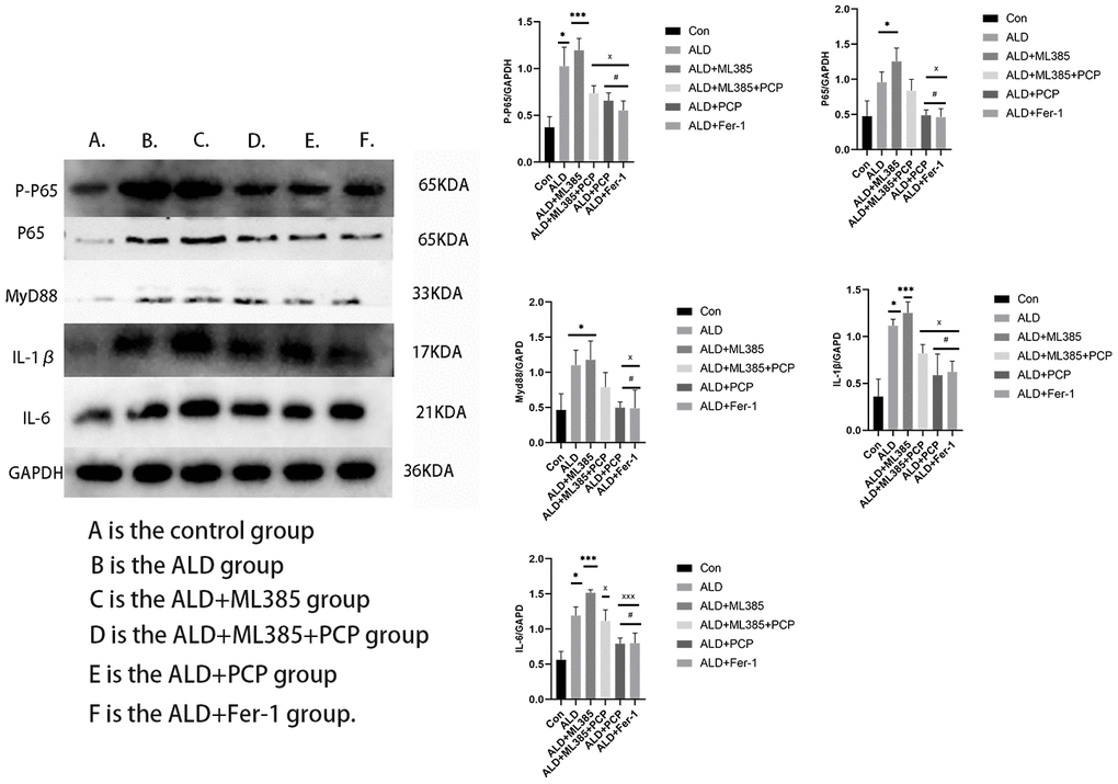 Additionally, the expression of inflammation and ferroptosis in the ALD+ML385 group was higher than in the ALD group, potentially because of the inhibition of the Nrf2 signaling pathway, and the oxidative stress state aggravates the outcome of inflammation and ferroptosis. However, after drug and inhibitor interventions, the expression of P65, P-P65, and MyD88 signals in the ALD+ML385+PCP group, ALD+PCP group, and ALD+Fer-1 group rats decreased. Simultaneously, the downstream inflammatory factor signaling pathways IL-1β and IL-6 also decreased, and the expression of Nrf2, HO-1, FTH1, GSH, and GPX4 signaling pathways was enhanced. These results are illustrated in Figure 6.