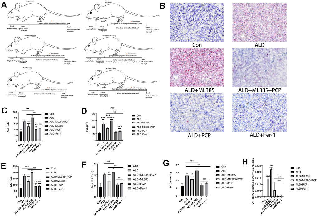 A total of 48 specific pathogen-free (SPF)–grade male Sprague Dawley rats, 8-weeks-old, with a body weight of 220±20 g, were provided by Hunan Experimental Changsha Tianqin Biotechnology Co., Ltd, bearing the experimental animal license number: SCXK (Xiang) 2019-0014. They were raised in separate cages in an SPF-grade experimental environment with a room temperature of 22±2°C and 12 hours of light (with alternating day and night), with free access to food and water. To establish an ALD rat model, all rats were randomly assigned to a control group, ALD group, ALD+ML385 group, ALD+ML385+PCP group, ALD+PCP group, or ALD+Fer-1 group. Rats in the blank group received distilled water of equal volume, while the other groups received high-alcohol white wine (10 mg/kg) [22] by gavage to establish the model. Rats modeled with high-alcohol white wine underwent drug intervention in the second week of gavage: ALD+ML385 (5 μg/kg/day, continuously for 6 weeks), ALD+ML385 (5 μg/kg/day, continuously for 6 weeks)+PCP group (100 mg/kg/day, continuously for 6 weeks), ALD+PCP group (100 mg/kg/day, continuously for 6 weeks), and ALD+Fer-1 group (100 μg/kg/day, continuously for 6 weeks). Rats in the control group and the ALD group received distilled water of equal volume by gavage.