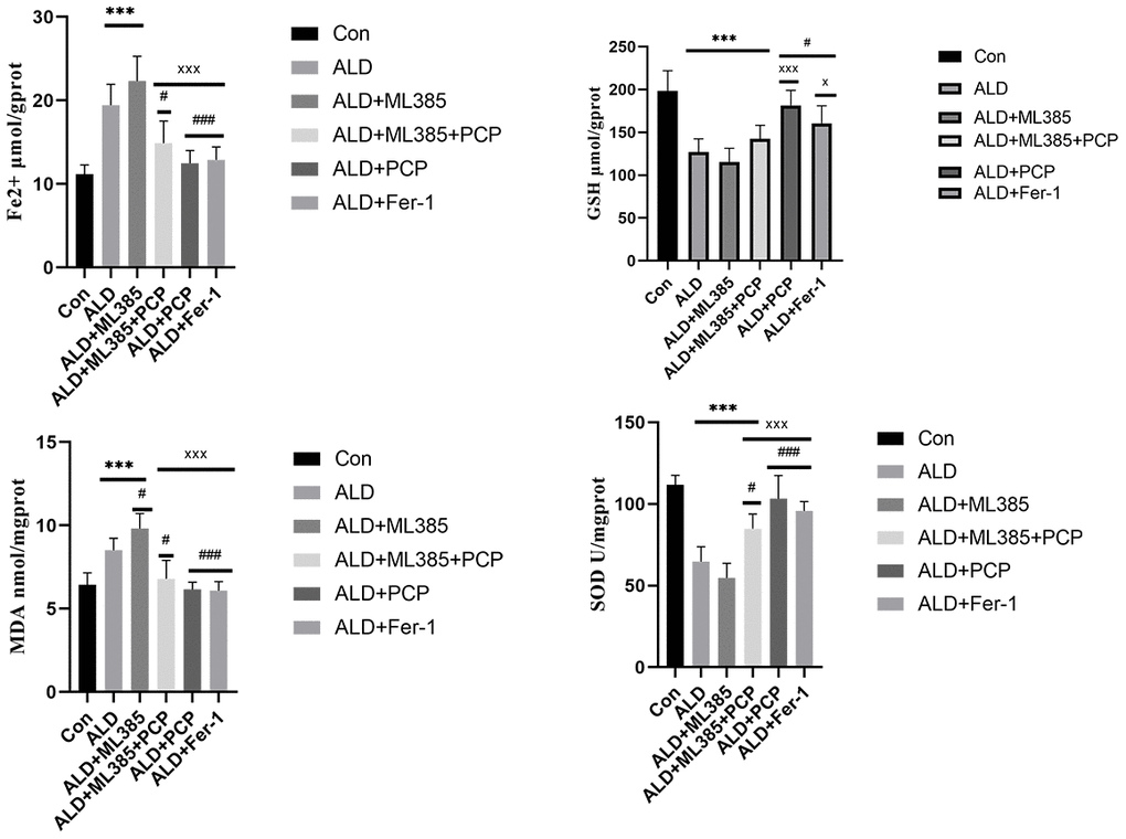 Under the influence of alcohol, a substantial amount of acetaldehyde causes damage to the structure and function of mitochondria. Simultaneously, it generates a significant quantity of ROS, inducing oxidative stress in the body [18]. This oxidative stress state downregulates the expression of hepcidin, leading to iron overload in the liver. The excess iron, in conjunction with oxidative stress, triggers cell death and exacerbates liver injury (Harrison 2006). Compared with the control group, the ALD rat group and the ALD+ML385 group exhibited a marked increase in ROS, lipid oxidation products such as MDA, and Fe2+. Additionally, a significant decrease in SOD and GSH was observed. In the treatment group, a substantial decrease in ROS, MDA, and Fe2+ was observed, accompanied by a significant increase in SOD and GSH. These findings indicate that alcohol-induced iron deposition in the liver may lead to lipid peroxidation, oxidative stress, and ferroptosis. However, treating this condition proves beneficial in reducing liver iron deposition and minimizing the interaction between iron and oxidative stress. The resultant cell ferroptosis mitigates liver damage. The results are presented in Figure 3.