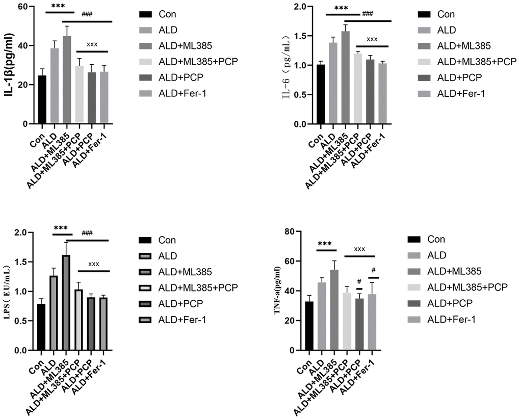 Prolonged alcohol consumption in patients with ALD results in increased intestinal permeability. Pathogenic factors, such as LPS, enter the hepatic venous circulation through the compromised intestinal barrier. This process activates Kupffer cells and the Toll-like receptor 4 (TLR4)-mediated downstream inflammatory pathway NF-κB, leading to the release of inflammatory cytokines (Wei et al., 2014). Inflammatory factors such as LPS, IL-1β, IL-6, and TNF-α in the ALD group and ML385 were significantly elevated compared with those in the control group. However, in the ALD+PCP group and the ALD+PCP+ML385 group, LPS, IL-1β, IL-6, TNF-α, and other inflammatory factors were significantly reduced. Similarly, the ALD+Fer-1 group exhibited suppressed expression of inflammatory factors. These findings suggest that inhibiting ferroptosis during ALD development can mitigate the production of inflammatory factors and chemokines, thereby ameliorating the effect of inflammation on the liver. The results are presented in Figure 4.