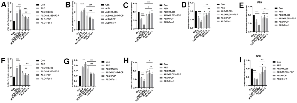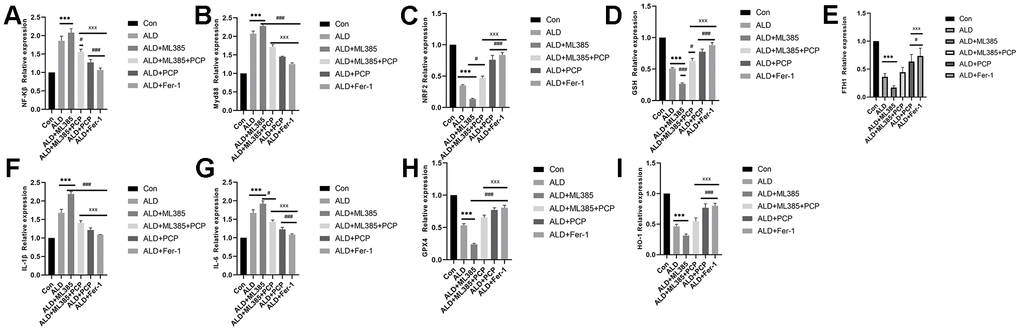 The liver damage caused by alcohol and the impact of PCP were assessed through PCR assays. Compared with the control group, mRNA expression of IL-1β, IL-6, NF-κB, and MyD88 in the liver tissue of rats in the ALD group and the ALD+ML385 group was significantly upregulated. Meanwhile, the expression of Nrf2, FTH1, GSH, GPX4, and HO-1 was significantly reduced. After the intervention of PCP and Fer-1, when compared with rats in the ALD group and the ML385 group, rats in the ALD+ML385+PCP group, ALD+PCP group, and ALD+Fer-1 group showed significantly decreased mRNA expression of IL-1β, IL-6, NF-κβ, and MyD88 in the liver tissue. However, the expression of Nrf2, FTH1, GSH, GPX4, and HO-1 significantly increased. These results are depicted in Figure 5.