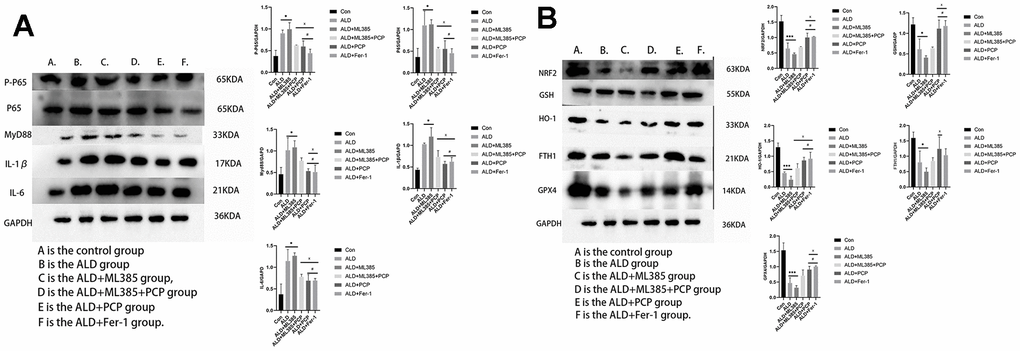 To elucidate the specific mechanism by which PCP improves the liver in ALD rats, we investigated signaling pathways related to NF-κB, Nrf2, and ferroptosis. Our findings revealed that, compared with the control group, the expression of P65, P-P65, and MyD88 signals in rats from the ALD group and the ALD+ML385 group was elevated, activating downstream inflammatory factor signaling pathways IL-1β and IL-6. This suggests that after alcohol induction, the NF-κB signaling pathway is activated, leading to an increase in inflammatory response, and iron overload in the liver contributes to ferroptosis. Consequently, the expression of Nrf2, HO-1, FTH1, GSH, and GPX4 signaling pathways decreases.