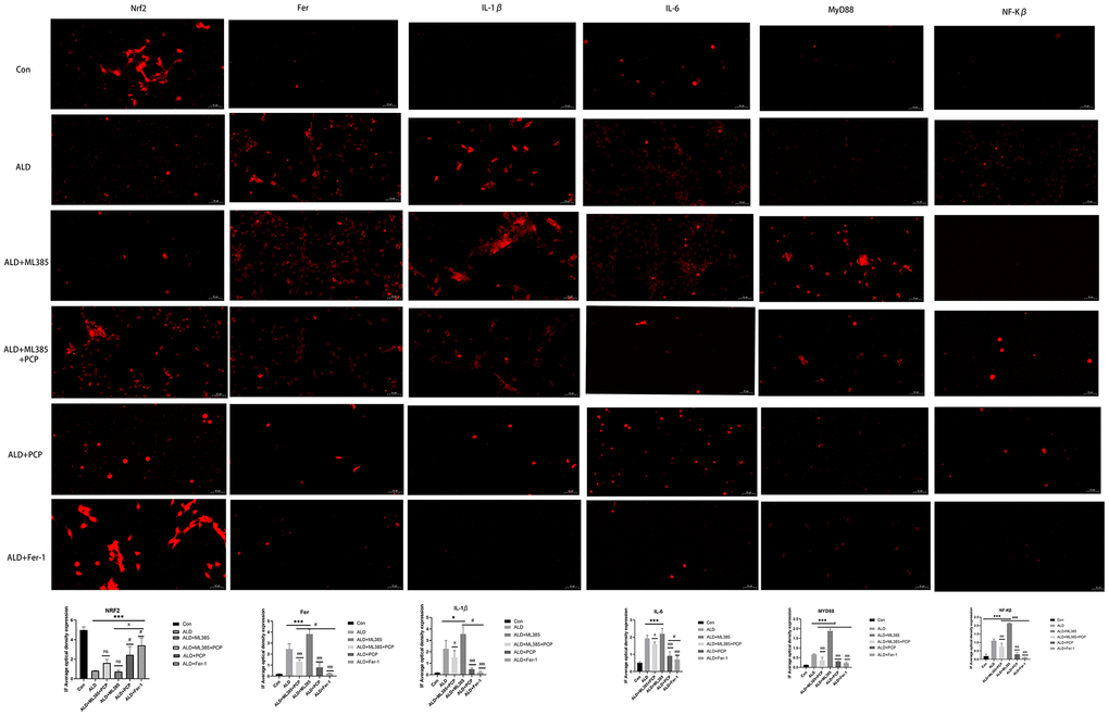 The expression levels of inflammatory factors, Nrf2, and Fer in BRL3A cells were assessed through immunofluorescence following alcohol and drug interventions. The results revealed a significant increase in the expression of IL-1β, IL-6, P65, MyD88, and Fe, accompanied by a notable decrease in Nrf2 expression, after alcohol intervention compared with the control group. Similarly, intracellular IL-1β, IL-6, P65, MyD88, and Fe demonstrated a substantial increase, while Nrf2 expression decreased significantly. By contrast, intervention with PCP and Fer-1 showed a significant decrease in the expression of IL-1β, IL-6, P65, MyD88, and Fe, coupled with a significant increase in Nrf2, when compared with the ALD group and the ALD+ML385 group. Figure 7 illustrates these results.