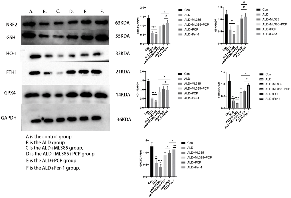 Alcohol impedes hepcidin expression, diminishing the body’s iron absorption capability and causing elevated iron levels. Consequently, ALD patients often experience excessive iron levels [33], triggering oxidative stress through the Fenton reaction and generating ROS. In the process, GSH is consumed, GXP4 activity is inhibited, lipid peroxidation occurs, inducing cell ferroptosis, and exacerbating ALD development [34, 35]. Our research on BLR3A cells treated with alcohol and Nrf2 inhibitors demonstrated decreased FTH1 and GXP signal expression, reduced GSH content, and elevated Fe2+ levels. This indicates that alcohol induction and inhibition of the Nrf2 signaling pathway leads to significant iron deposition, promoting cell death. Notably, these adverse effects were mitigated in cells treated with PCP and ferroptosis inhibitors.