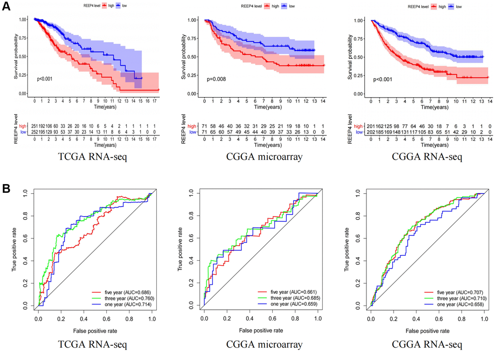 It is significant that pathogenic genes lead to reduced survival time in patients with cancer [19]. Therefore, we tried to reveal the impact of REEP4 on the survival time of patients with LGG. Firstly, the results of Kaplan-Meier curves showed that the overall survival time of patients with LGG in the high REEP4 expression group was significantly lower than that in the low REEP4 expression group based on the CGGA microarray, CGGA RNA-seq, and TCGA RNA-seq (Figure 3A). It is worth emphasizing that the impact of REEP4 on the disease free survival time of patients with LGG has similar results (Supplementary Figure 2A). Subsequently, ROC analysis showed that high REEP4 expression had good diagnostic value for the prognosis of patients with LGG based on the above three datasets (Figure 3B). These results suggest that the high expression of REEP4 was associated poor prognosis of LGG.