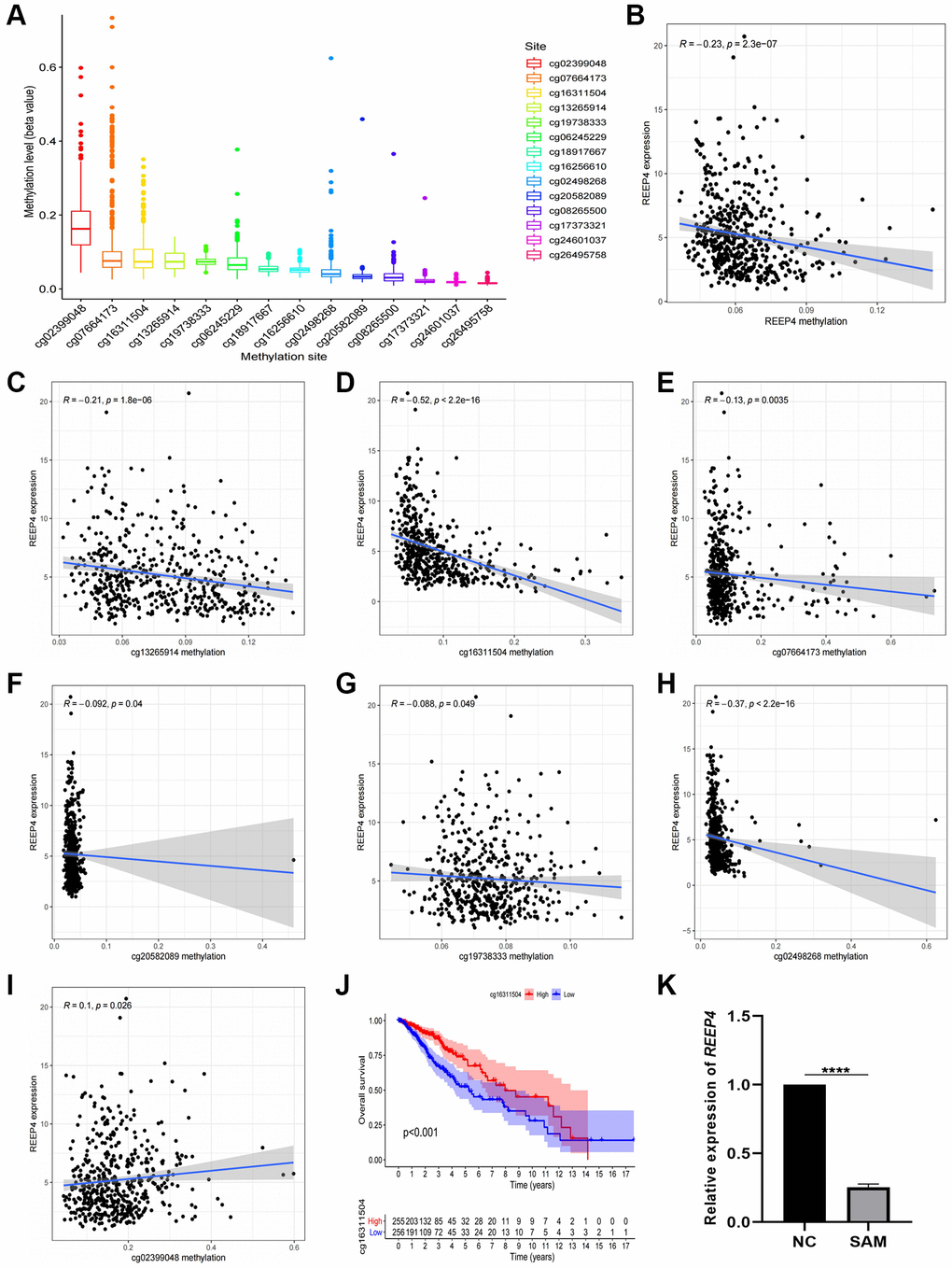 So, why is REEP4 significantly higher in LGG at both transcriptome level and protein expression level? According to the theory of epigenetics, different states of DNA methylation can regulate downstream gene expression [36], which provides a theoretical basis for answering the question of the increased expression of REEP4 in LGG. Therefore, we speculate that elevated REEP4 expression is caused by a reduction in DNA methylation. To confirm this hypothesis, we first extracted 14 DNA methylation states that regulate REEP4 expression. Co-expression analysis then showed that the DNA methylation level of REEP4 indeed showed a significant negative regulatory relationship with its expression level. More importantly, we first used SAM (methylating drugs) to further verify the results and thereby improve the methylation level of the SHG-44 of LGG cell line [37]. We then used RT-qPCR to confirm that the expression level of REEP4 was indeed significantly reduced. Therefore, we confirmed that a reduction in DNA methylation led to increased REEP4 expression in the pathological process of LGG. However, it must be noted whether the abnormal state of the DNA methylation states of REEP4 will affect the survival time of LGG patients. To solve this problem, we used Kaplan-Meier curves and found that hypermethylation of only one methylation site (cg16311504) was significantly associated the survival time of patients with LGG. Therefore, we speculate that cg16311504 may be further used as a biomarker to improve the prognosis of patients with LGG.