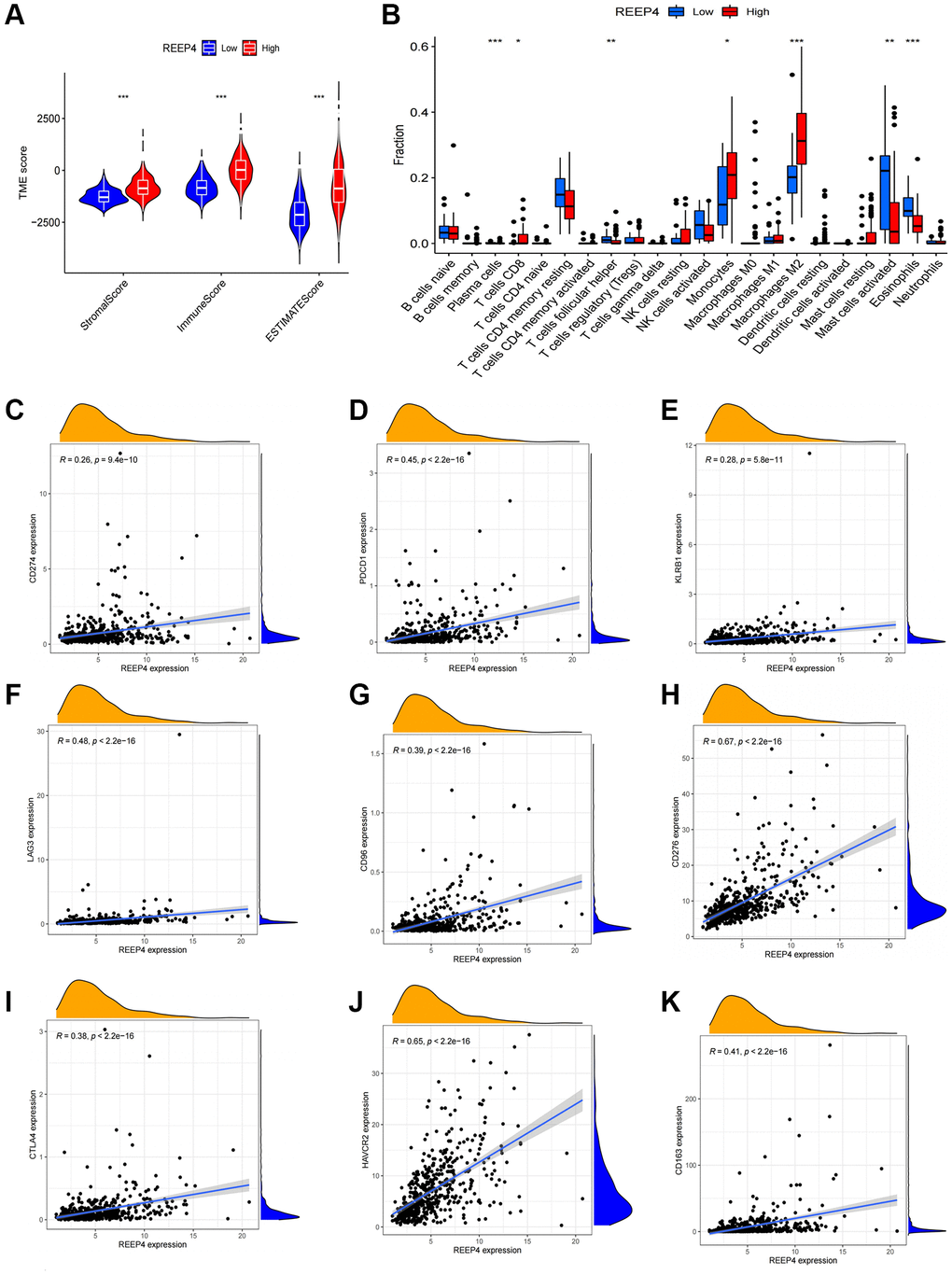Finally, anti-tumor immunotherapy is a current research hotspot. Identifying new immune checkpoints will help researchers develop new drugs for anti-tumor immunotherapy [22]. Therefore, we tried to reveal the relationship between REEP4 expression and known immune checkpoints based on TCGA-RNA-seq results and found that REEP4 had a high positive expression relationship with the eight most common immune checkpoints (Figure 6C–6K). Therefore, revealing the relationship between REEP4 and immune checkpoints will help to improve the progress of anti-tumor immunotherapy.