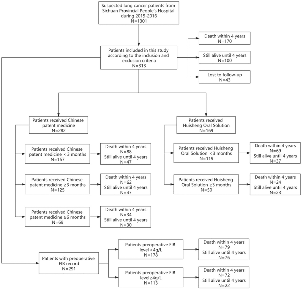 1301 patients were diagnosed with lung cancer in Sichuan Provincial People’s Hospital during 2015–2016. 313 patients among them were finally included in statistical analysis according to the inclusion and exclusion criteria. The follow-up period was 48 months, 170 (54.3%) patients died in 4 years, 43 (13.7%) patients lost to follow-up, and 100 (31.9%) patients were still alive until the end of this study. The study was reviewed and approved by the Ethics Committee of Sichuan Provincial People’s Hospital (Number: 2019-205). Written informed consent for participation was acquired.