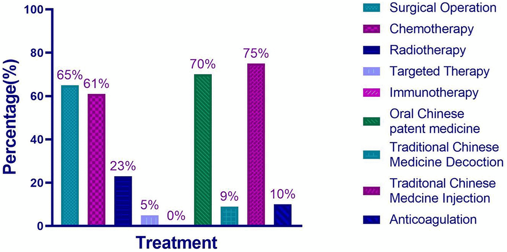 The frequency of all kinds of treatments for patients diagnosed with stage II and III NSCLC in Sichuan Provincial People’s Hospital during 2015–2016 was shown in Figure 2. The frequency of surgery was 65%, chemotherapy was 61%, radiotherapy was 23%, targeted therapy was 5%, oral CPM was 70%, TCM decoction was 9%, CPM injection was 75%, and oral anticoagulant drug was 10%. None of patients received immunotherapy.