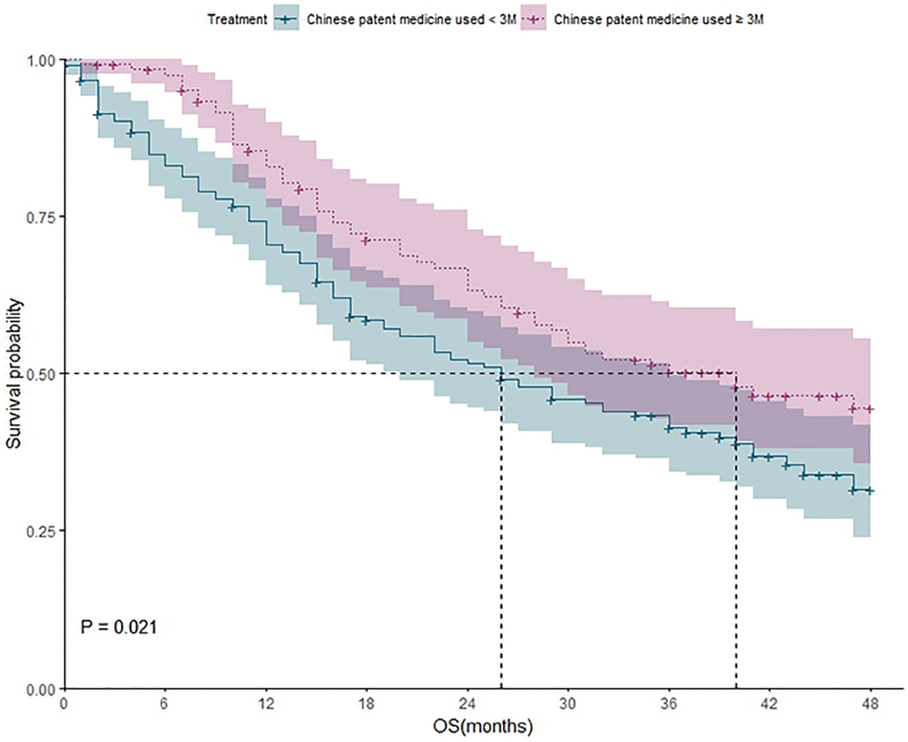 188 patients received CPM less than 3 months, 105 of them died during the study. The one-year, two-year, three-year, and four-year survival rate were 70%, 51%, 41%, and 31%, respectively. 125 patients received CPM for more than 3 months, and 62 of them died during the study. The one-year; two-year; three-year and four-year survival rate were 83%, 63%, 50%, and 42%, respectively. Kaplan-Meier method was applied to analyze the difference of outcomes between two groups, and the results showed that the difference between two groups was statistically significant (P = 0.021), which indicated that the 4-year survival rate of patients with CPM used for ≥3 months was higher than that of patients with CPM used for <3 months (Figure 3). The shadow of two survival curves in different color represented the 95% confidence interval of survival probability for each curve, which also applied to Figures 4 and 5.