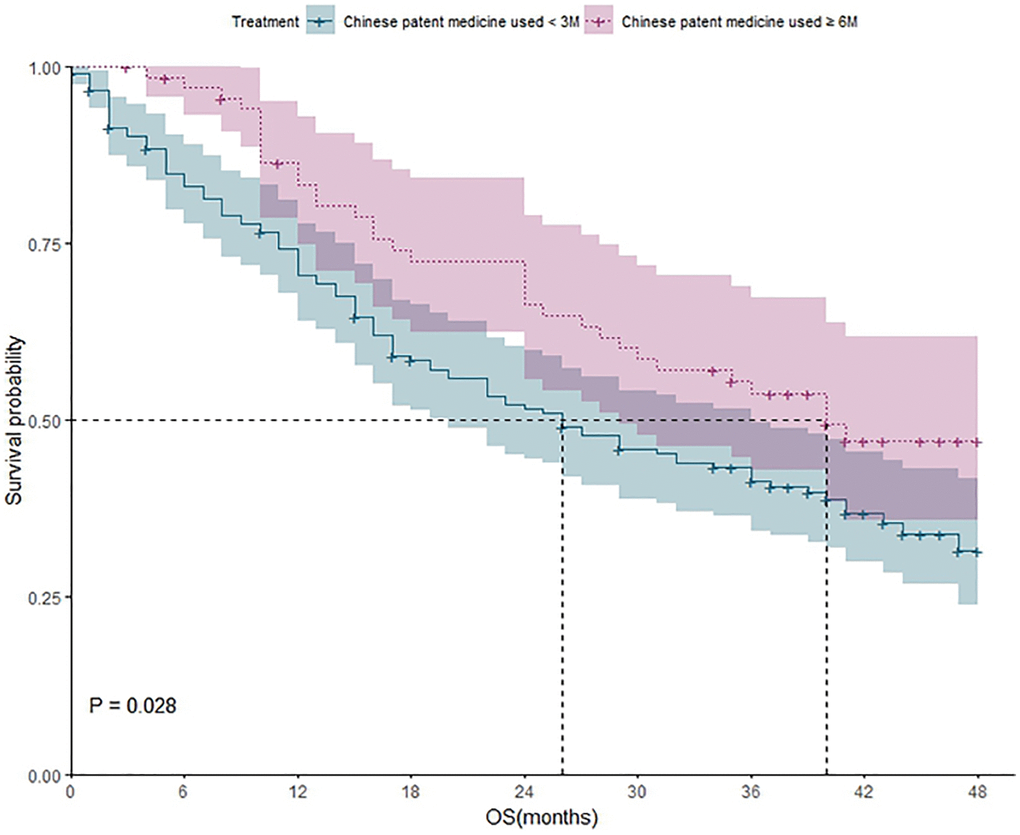 188 patients received CPM for less than 3 months, and 105 of them died during the study. The one-year, two-year three-year, and four-year survival rate were 70%; 51%; 41%, and 31%, respectively. 69 patients received CPM for more than 6 months, and 34 of them died during the study. The one-year, two-year, three-year, and four-year survival rate were 83%, 66%, 53%, and 43% respectively. Kaplan-Meier method was applied to analyze the difference of outcomes between two groups, and the result showed that the difference between the two groups was statistically significant (P = 0.028). It revealed that the 4-year survival rate of patients with CPM used for ≥6 months was higher than that of patients with CPM used for <3 months (Figure 4).