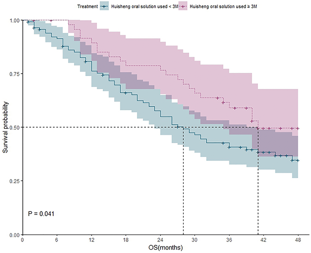 117 patients received HSOS less than 3 months, and 68 of them died during the study. The one-year, two-year, three-year, and four-year survival rate were 75%, 54%, 40%, and 35%, respectively. 50 patients received HSOS more than 3 months, and 22 of whom died during the study. The one-year, two-year, three-year, and four-year survival rate were 89%, 77%, 60%, and 51%, respectively. Kaplan-Meier method was applied to analyze the difference of outcomes between two groups, and the result showed that the difference between two groups was statistically significant (P = 0.041), which demonstrated that the 4-year survival rate of patients with HSOS used for ≥3 months was higher than that of patients with HSOS used for <3 months (Figure 5).