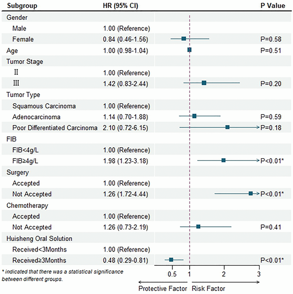 Huisheng oral solution, a CPM composed of 34 Chinese medicine components, is commonly prescribed to treat tumor in China. Previous experiments demonstrated that HSOS exerted anti-tumor effect via enhancing body immunity, promoting blood circulation and removing blood stasis [16–19] and reduce the level of PLT and FIB in SD rats [20]. Another animal experiment found that HSOS showed benefits in reducing the level of FIB, down-regulating the expression of related factors in C57 mice, and improving blood hypercoagulative state, thus achieved anti-tumor effects [21]. However, few epidemiologic studies have focused on the association between different cumulative treatment durations of CPM/HSOS and NSCLC patient’s survival rate. Therefore, this study was conducted to evaluate the effect of CPM/HSOS on four-year survival rate of patients with stage II and III NSCLC, and to figure out the relationship between blood coagulation indicators and survival outcomes.