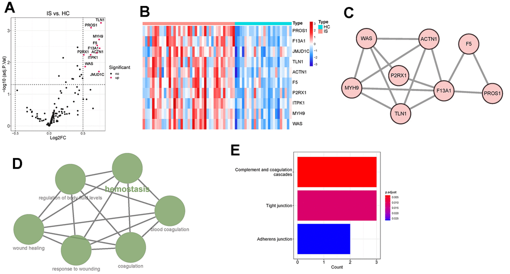 By limma, ten DECGs, including talin 1 (TLN1), protein S (PROS1), myosin heavy chain 9 (MYH9), coagulation factor V (F5), coagulation Factor XIII A Chain (F13A1), actinin alpha 1 (ACTN1), purinergic receptor P2X 1 (P2RX1), inositol-tetrakisphosphate 1-kinase (ITPK1), WASP actin nucleation promoting factor (WAS) and Jumonji domain containing 1C (JMJD1C), were found to be significantly upregulated in IS group compared with those in HC group (Figure 1A, 1B). In the predicted PPI network, we observed that TLN1, PROS1, MYH9, F5, F13A1, ACTN1, P2RX1 and WAS had direct and/ or indirect interactions with each other (Figure 1C). ClueGO analysis revealed that the DECGs were clustered into six interacted functional groups, including hemostasis, regulation of body fluid levels, blood coagulation, wound healing, response to wounding and coagulation (Figure 1D). Further functional analysis on those DECGs showed that they were remarkably enriched in the pathways of complement and coagulation cascades, tight junction and adherent junction (Figure 1E). In consideration that all those functional groups and pathways are closely associated with immune and neuroinflammation [19–21], we next investigated whether there was crosstalk between DECGs and immune/ inflammation of IS.