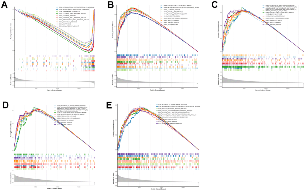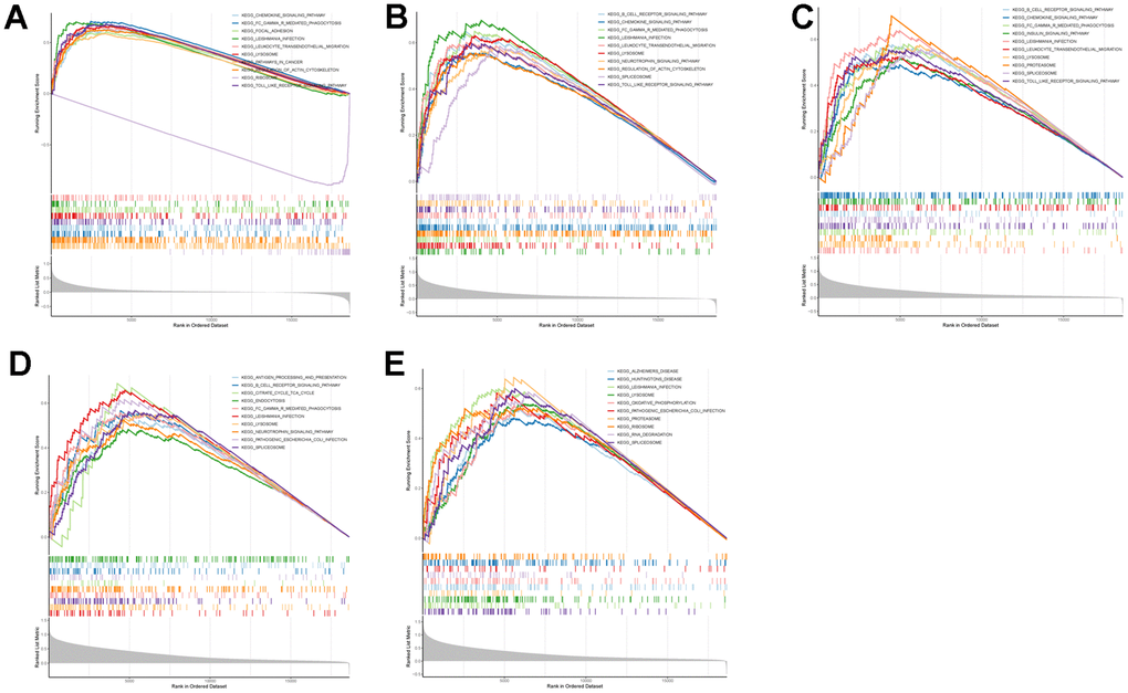 To further explore the potential mechanisms of TLN1, F5, ACTN1, WAS and JMJD1C in regulating IS, we performed GSEA analysis. As for GO terms, ACTN1 was more related to protein synthesis and processing, such as translation termination and cytosolic ribosome (Figure 9A), while TLN1, F5, WAS and JMJD1C were more involved in immune-related function, such as myeloid leukocyte mediated immunity, activation of innate immune response, antigen processing and presentation (Figure 9B–9E). As for KEGG pathways, ACTN1, TLN1, F5 and WAS were mainly enriched in immune-related pathways, such as chemokine signaling pathway, B cell receptor signaling pathway, Fc gamma R-mediated phagocytosis, antigen processing and presentation (Figure 10A–10D), while JMJD1C was more likely participated in pathways related to neuroinflammation, such as Alzheimer’s disease, Huntington’s disease and oxidative phosphorylation (Figure 10E). Taken together, those findings suggest that TLN1, F5, ACTN1, WAS and JMJD1C may regulate the development of IS mainly by immune and inflammation.