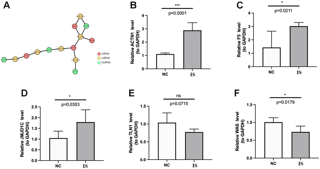 Finally, a mRNA-miRNA-lncRNA network was constructed, which was composed of 4 key genes (TLN1, ACTN1, WAS and JMJD1C), 6 miRNAs (mir-138-5p, mir-140-5p, mir-133a-3p, mir-210-3p, mir-326, mir-331-3p) and 4 lncRNAs (CYTOR, MEG3, HOTAIR, XIST) (Figure 11A). In the mRNA-miRNA-lncRNA network, multiple regulatory relationships were predicted, for instance, MEG3 and HOTAIR may regulate the expression of ACTN1 by interacting with hsa-miR-133a-3p and hsa-miR-326, respectively. Moreover, we validated the expressions of TLN1, F5, ACTN1, WAS and JMJD1C using clinical IS samples and control samples. The qPCR results showed that ACTN1, F5 and JMJD1C were significantly up-regulated in IS (Figure 11B–11D), which were consistent with sequencing results. However, the expression patterns of TLN1 and WAS conflicted with sequencing results (Figure 11E, 11F).