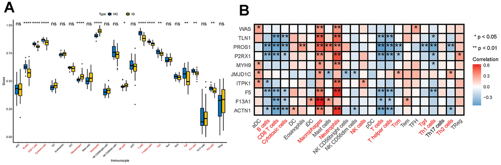Immune cells are the main players in the immune and inflammatory system. Therefore, we first explored whether the infiltration of immune cells between IS and HC were different by calculating the proportions of infiltrating immune cells in IS and HC samples by ssGSEA (Supplementary Table 1). By comparison, we found significantly lower levels of B cells, CD8 T cells, cytotoxic cells, T cells, helper T cells, Tcm, Tgd, Th1 cells and Th2 cells and higher levels of macrophages, neutrophils and NK cells in IS group (Figure 2A), indicating that immune environment is altered in IS. Further Spearman analysis partially supported our hypothesis that DECGs had a close relationship with the immune microenvironment of IS. In detail, PROS1, P2RX1, ITPK1, F5 and ACTN1 were significantly negatively correlated with B cells. TLN1, PROS1, P2RX1, F5, F13A1 and ACTN1 had remarkably negative associations with CD8 T cells and cytotoxic cells. Except ITPK1, the other 9 DECGs were positively correlated with macrophages (p <0.05). As for neutrophils, they have positive relationship with DECGs except JMJD1C and F13A1 (p <0.01). NK cells were only positively correlated with ITPK1 (p <0.05). Also, we observed that TLN1, PROS1, P2RX1, F5, F13A1 and ACTN1 had significantly negative correlations with T cells and T helper cells. In addition, PROS1, P2RX1 and JMJDC1 were remarkably correlated with Tcm. Tgd was only significantly related to the expression of PROS1. Th1 cells had significant correlations with TLN1, PROS1, P2RX1, MYH9 and F5, while Th2 cells were remarkably correlated with PROS1, JMJD1C and ACTN1 (Figure 2B). Collectively, DECGs may be involved in IS immune microenvironment by interacting with common and/ or specific immune cells.