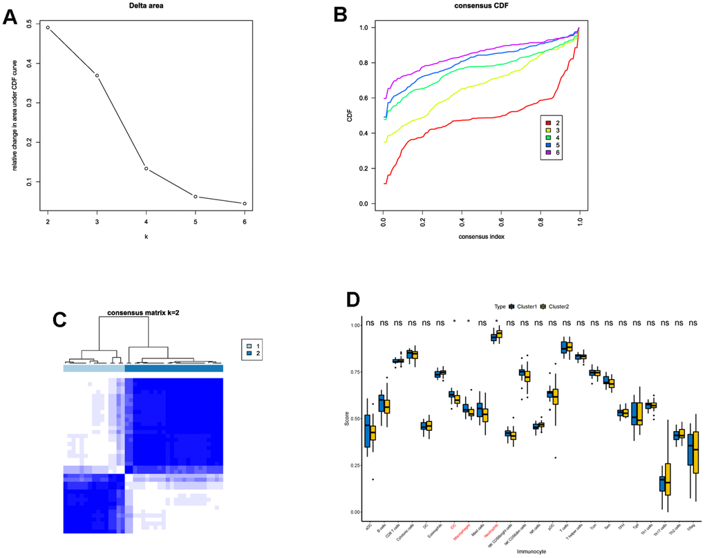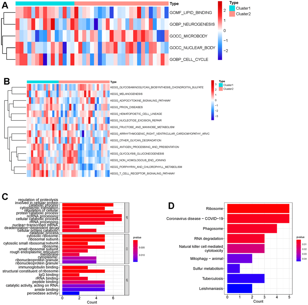 Next, we performed consensus clustering, and found that those DECGs could divide IS patients into two subgroups (cluster 1 and cluster 2, Figure 3A–3C). Furthermore, we analyzed and compared the characteristics of two clusters. We observed that cluster 1 had less neutrophils and more iDC and macrophages compared to cluster 2 (p <0.05, Figure 3D). In addition, gene set variation analysis (GSVA) results revealed that physiological function related to GO terms of lipid binding, neurogenesis, microbody, nuclear body, cell cycle (Figure 4A), and pathways associated with metabolism, cell behavior and immune system, such as adipocytokine pathway, glycosaminoglycan biosynthesis, nucleotide excision repair, antigen processing and presentation, glycolysis/gluconeogenesis, non-homogenous end joining and T cell receptor signaling pathway (Figure 4B) were differentially enriched between two clusters, indicating that IS patients in two clusters may vary in metabolism, cell behavior and immune. Similar to GSVA results, biological function analysis showed that DEGs between two clusters (Supplementary Table 2) were significantly enriched in the BPs of cellular catabolic process, ncRNA processing, cytoplasmic translation, CCs related to ribosome, endoplasmic reticulum membrane, MFs of immunoglobulin binding, structural constituent of ribosome and IgG binding (Figure 4C) and pathways of ribosome, COVID-19, RNA degradation and phagosome (Figure 4D), which also had close relationship with metabolism, cell behavior and immune.