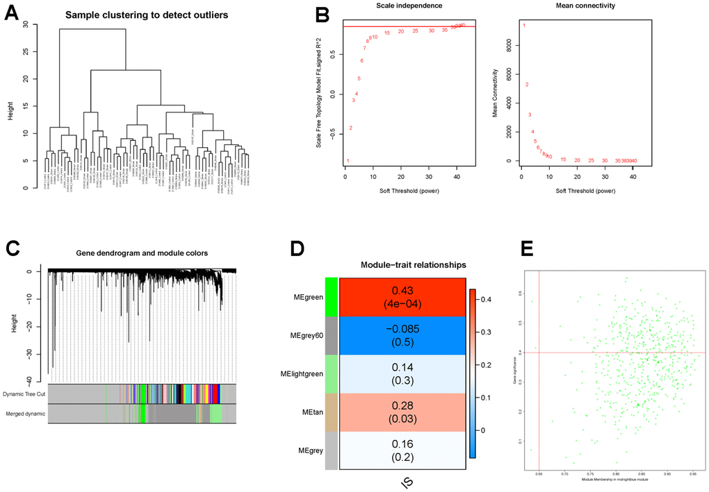 WGCNA (version 1.70-3) package [59] was performed to construct a co-expression network to find the gene module most related to IS. Firstly, the clustering of the IS samples was carried out to detect outlier samples to ensure the accuracy of the subsequent analysis. The soft threshold of the data was determined to achieve a scale-free topology. Based on optimal soft thresholds, we set a minimum number of genes in per module as 100 according to dynamic tree cutting algorithm. The correlation between module and IS was calculated to obtain the key module. A scatter plot was drawn for key module to show the correlation between GS and MM.
