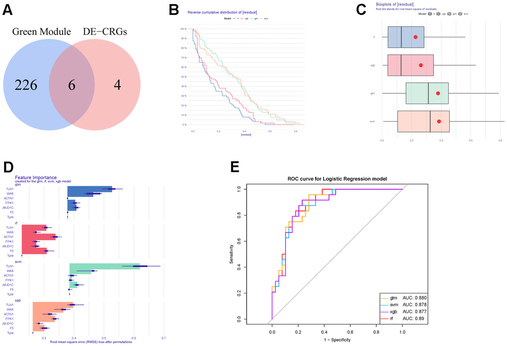 Firstly, candidate genes were obtained by intersection of DECGs with key modular genes. Then, to further assess the importance of candidate genes in IS, 4 types of machines learning method, including RF, SVM, GLM and XGB were performed, respectively. Four models were calculated using the DALEX (version 2.3.0) package to draw the residual distribution map to obtain the best model. Next, the discriminant performance of four machine learning algorithms in GSE16561 data set was evaluated by ROC curves. Genes obtained by the algorithm with the best evaluation effect were selected as candidate key CGs for further analysis. Finally, to study the ability of candidate key CGs to distinguish between IS samples and HC samples, ROC curves of candidate key genes were drawn by pROC package [60]. The area under curve (AUC) value ≥ 0.7 was selected as diagnostic CGs. The ggplot2 (version 3.3.5) package [58] was used to show the expressions of diagnostic CGs in GSE16561 and GSE58294 data set, respectively.