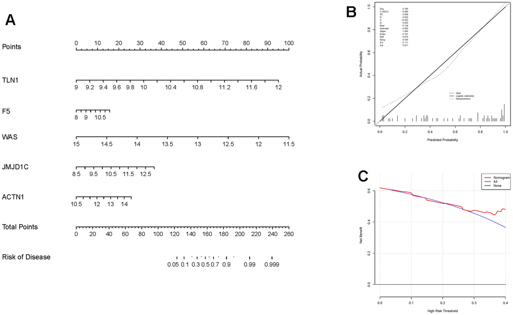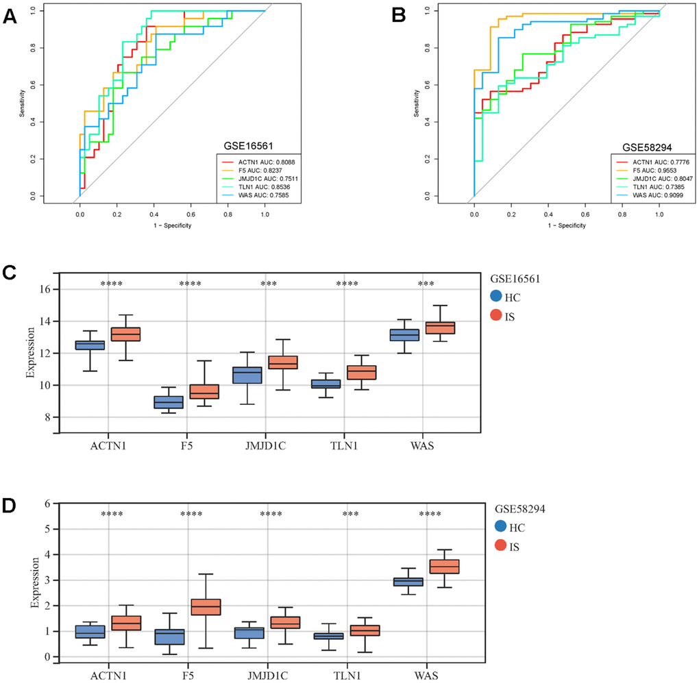 Moreover, those six candidate genes were input into RF, SVM, GLM and XGB algorithms to evaluate their importance. We found that RF algorithm was the most accurate one with the lowest residual value (Figure 6B, 6C), in which the rank order of feature importance was ACTN1, F5, TLN1, JMJD1C, WAS and ITPK1 (Figure 6D). Moreover, RF model had the best performance to distinguish IS from HC samples with the AUC of 0.89 (Figure 6E). Furthermore, we investigated the diagnostic potential of ACTN1, F5, TLN1, JMJD1C, WAS and ITPK1 in IS by receiver operating characteristic (ROC) curves, which showed that TLN1, F5, ACTN1, WAS and JMJD1C may be potential diagnostic biomarkers in both testing (GSE16561, Figure 7A) and validation (GSE58294, Figure 7B) cohorts. Therefore, TLN1, F5, ACTN1, WAS and JMJD1C were considered as key CGs in IS. We found that the expression patterns of TLN1, F5, ACTN1, WAS and JMJD1C were consistent in the testing and validation cohorts (Figure 7C, 7D), further suggesting their importance in IS. At last, TLN1, F5, ACTN1, WAS and JMJD1C were used to construct the nomogram to predict the risk of IS onset (Figure 8A). Both calibration curve (Figure 8B) and decision curve (Figure 8C) demonstrated the good performance of nomogram to predict IS.
