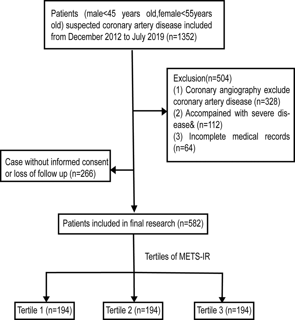 From late September 2022, we started to collect patient data from electronic medical record system of the Qilu Hospital of Shandong University. Total of 1352 patients (female<55 years, male<45 years) who were suspected of CAD underwent coronary angiography from December 2012 to July 2019 were included. 1024 patients were diagnosed with CAD, which is determined by the existence of obstructive stenosis of >50% in any of the main coronary arteries, consisting of the left main coronary artery (LM), right coronary artery (RCA), left anterior descending artery (LAD) and left circumflex coronary artery (LCX) [21]. Patients with incomplete medical records (n=64) or severe disease [including severe cardiac value disease, decompensated heart failure, non-ischemic dilated cardiomyopathy, severe hepatic disease or renal (liver function parameters>3 × upper normal value or serum creatinine>1.4 mg/dL), acute infection or inflammation, autoimmune disease or hematologic disease and malignancy, n=112] were removed from this study. 848 patients were admitted in the study and followed up from October 2022 to November 2022. 582 patients (68.6%) completed the phone follow-up after providing verbal consent (Figure 1).