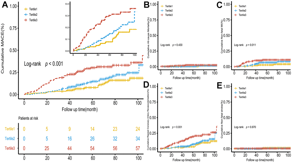 The mean age of the patients was 44.43±6.33 years and 352 (60.5%) patients were male. According to the occurrence of MACE, the baseline characteristics were presented in Table 1. Patients with MACE were those tended to be smokers (p=0.022), or to have FH-CAD(p=0.037), DM(p<0.001), hypertension(p=0.024) or multivessel disease(p<0.001). BMI(p=0.010), GS(p=0.023), FPG(p<0.001), TG(p=0.002), HDL-C(p=0.022) and use of oral hypoglycemic drugs (p=0.013) and insulins(p<0.001) were also significantly different between the two groups. Furthermore, patients who experienced MACE had a significantly higher level of METS-IR compared to those who did not experience MACE (44.88±8.11 vs 41.68±6.87, p<0.001). As presented in Table 2, patients were divided into three groups based on the tertiles of METS-IR (Tertile1: n=194, METS-IR < 39.18; Tertile2: n=194, 39.18 ≤ METS-IR < 45.01; Tertile3: n=194, METS-IR≥45.01). Significant differences were found among three groups in terms of age, gender, BMI, GS, current smoking, FH-CAD, DM, FPG, TC, TG, HDL-C, UA, ACEI/ARB, oral hypoglycemic drugs, insulins, MACE, non-fatal MI, repeat coronary artery revascularization (Table 2). In addition, we compared the baseline data of the population finally included in the study and those who lost follow-up and found no significant difference (Supplementary Material: Supplementary Table 1).