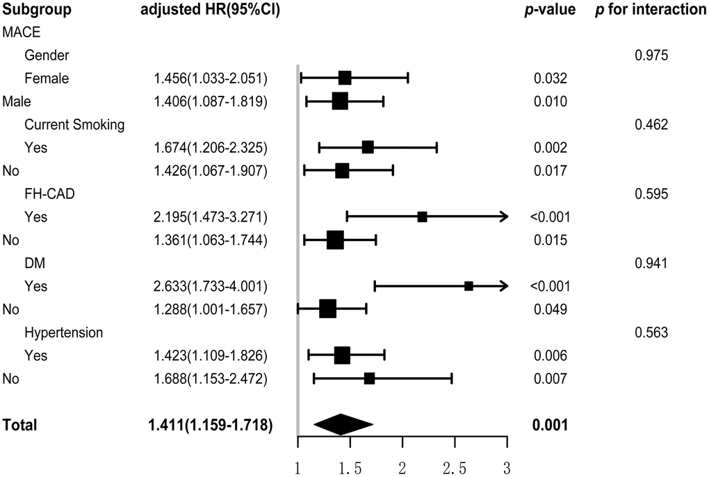Subgroup analysis, based on the gender, current smoking, FH-CAD, DM, and hypertension, was used to examine the association between METS-IR and MACE. There was non-significant interaction found in this subgroup analysis. Significance was observed in every subgroup. The evidence suggested that METS-IR was a significant risk factor for incidence of MACE in general premature CAD patients (Figure 3).