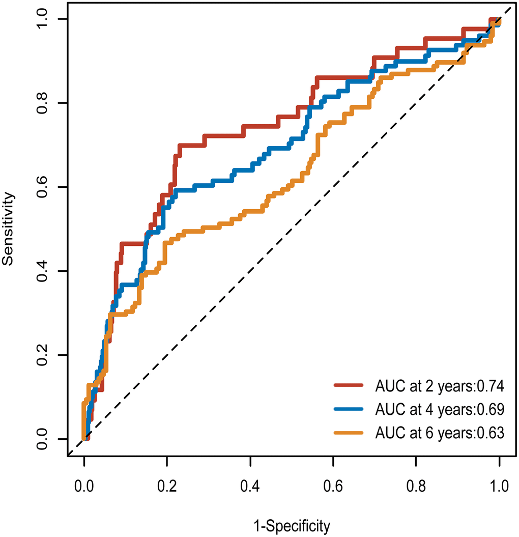 The AUC was 0.74 at 2 years, 0.69 at 4 years, and 0.63 at 6 years (Figure 4). The incremental predictive value of METS-IR for MACE, repeat coronary artery revascularization and non-fatal MI were presented in Table 7. According to C-Statistic, risk prediction for MACE was significantly improved after adding METS-IR to existing risk prediction model (C-Statistic increased from 0.71 to 0.72, p<0.001). Additionally, the improvement in risk prediction of METS-IR for MACE was also reflected in NRI and IDI [Continuous NRI (95%CI) = 0.19 (-0.01-0.39), p=0.061; IDI (95%CI) = 0.02(0.00-0.03), p=0.007]. Significant improvement was also discovered in risk prediction for non-fatal MI and repeat coronary artery revascularization. Compared with model 3 without METS-IR, the AIC and BIC were significantly improved in predicting MACE and non-fatal MI and significant improvement of AIC was only observed in predicting repeat coronary artery revascularization (Table 8).