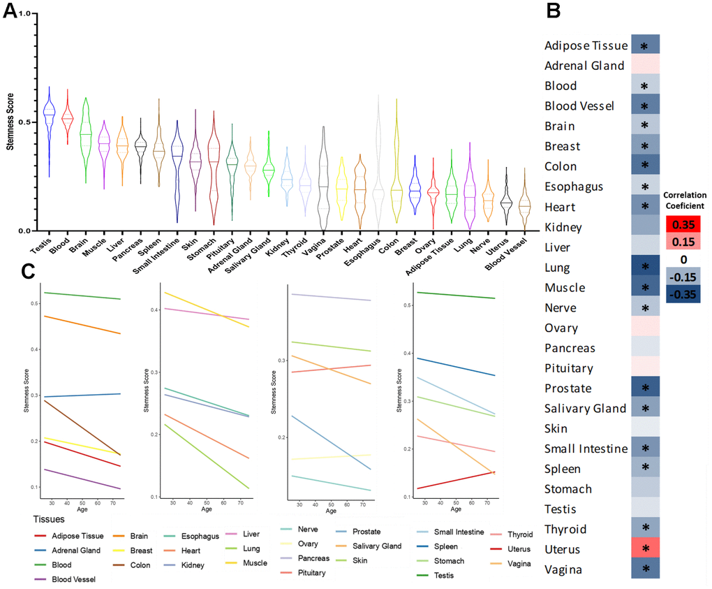 In this study, we applied a machine learning method to detect stemness signatures from transcriptome data of healthy human tissues (see Methods). The methodology, developed by Malta et al. [9], was trained on stem cell classes and their differentiated progenitors and went through rigorous validation steps by Malta et al., including tests in several datasets from tumor and non-tumor samples. Although initially used to study oncogenic dedifferentiation, this approach has also been employed to study normal and pathological (non-tumorous) samples [11–15]. Therefore, we first downloaded expression data of 17,382 samples, divided into 30 tissues aged between 20 and 79 years, from GTEx in transcripts per million (TPM) [16]. After that, we followed the methodology by Malta et al. and assigned a stemness score to all GTEx samples [9]. Briefly, the stemness score varies from 0 (lowest stemness of the samples) to 1 (highest stemness of the samples). All the data generated are in Supplementary Table 1 and include the stemness score and clinical data from GTEx.