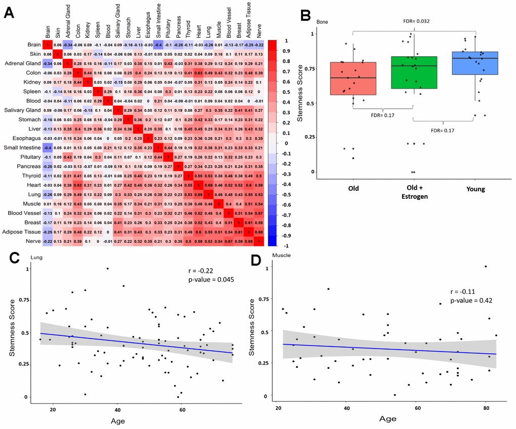 It is important to note that many questions remain open. Our analyses are mainly correlation tests; therefore, we cannot determine cause and effect. This is important as we cannot assure whether the loss of stemness contributes to aging or is a cause or response of aging processes. Furthermore, we do not know whether the decrease in stemness a direct reduction of the stem cell pool is or refers to intrinsic characteristics of different cells in the tissue. In this sense, our HSC analyses corroborate a functional problem in aged stem cells, at least in blood stem cells. Ultimately, it is crucial to determine what drives these changes and which patterns and genes are associated with this process. Here is essential to highlight some papers that suggest that epigenetic modifications regulate stemness and could be a promising area for future studies [33, 34]. Additionally, our analyses suggest that stemness is a global attribute of the organism which correlates across tissues (except the brain), and future analyses may investigate how genetic polymorphisms contribute to individual stemness. Specifically, genome-wide association studies could be insightful in elucidating mechanisms associated with stemness. Additionally, the correlation of stemness among tissues could reflect systemic factors such as hormones (as suggested by the effect of estrogen in Figure 2B) or inflammation that impact cell proliferation [35, 36]. This presents three potential scenarios: the pan-tissue decrease in stemness may indicate either cell-intrinsic mechanisms, a systemic phenomenon, or a combination of both.