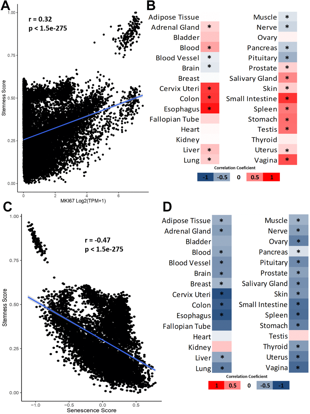 To explore potential mechanisms, we associated stemness with cell proliferation and senescence, two processes associated with aging. We investigated the correlation between stemness and cell proliferation by acquiring gene expression data (in TPM) for the MKI67 proliferation marker from GTEx. Subsequently, we conducted a correlation analysis between the MKI67 expression and the stemness score of the samples. Figure 3A shows the correlation between stemness and proliferation in all GTEx samples (Pearson’s correlation test). Figure 3B shows a heatmap of the correlation coefficient in all tissues from GTEx (Pearson’s correlation test followed by Benjamini-Hochberg correction).