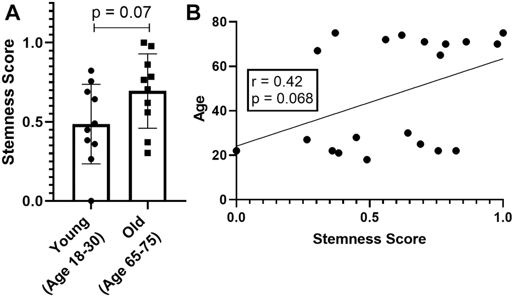 We first downloaded normalized counts of bulk RNA-seq from the work of Adelman et al. [27]. In this study, the authors isolated human hematopoietic stem cells from two groups with ten samples each: young (age 18-30) and old (age 65-75). We applied the same approach as above to generate stemness scores in these samples. We then compared stemness with age by direct comparison between the two groups (Student’s t-test) and by Pearson correlation. The graphs for this analysis were constructed using GraphPad Prism 8.