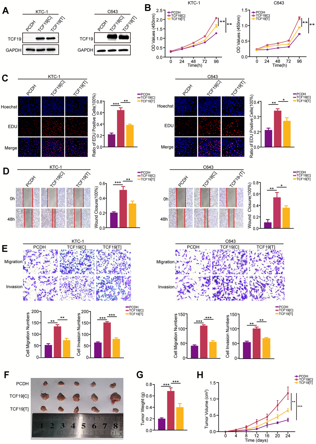 To detect the function of TCF19 and the SNP in thyroid cancer progression, we established TCF19[C] (rs2073724[C]) expression and TCF19[T] (rs2073724[T]) overexpression in thyroid cancer. RT-qPCR and Western blot analysis confirmed that TCF19 was strongly overexpressed. There was no significant difference in the expression level between TCF19[C] and TCF19[T] (Figure 2A and Supplementary Figure 4A). CCK-8 and EdU assays revealed that TCF19[C] overexpression promotes thyroid cancer cell proliferation, and TCF19[T] partly blocked these effects (Figure 2B, 2C). Additionally, we also performed Transwell and wound healing assays. As we observed previously TCF19[C] significantly increased the migration and invasion of thyroid cancer cells, while overexpression of TCF19[T] notably reduced these abilities affected by TCF19[C] overexpression (Figure 2D). Taken together, TCF19 plays an oncogenic role in thyroid cancer progression. Notably, the alternative allele of the SNP is required for the effect of TCF19 on thyroid cancer progression. In addition, we also established stable TCF19-knockdown TC cells (Supplementary Figure 4A, 4B). As expected, downregulation of TCF19 suppressed the proliferation, migration, and invasion of thyroid cancer cells compared with control cells, as demonstrated by CCK-8, EdU, Transwell, and wound healing assays (Supplementary Figure 4C–4F). These results indicate that TCF19 regulates the proliferation, migration and invasion of thyroid cancer cells in vitro. To investigate TCF19’s function in tumorigenesis in vivo, we conducted subcutaneous tumor formation assays using nude mice. We injected nude mice subcutaneously with C643 cells overexpressing either TCF19[C] or TCF19[T], along with a control group. The mice were euthanized 24 days post-injection to assess tumor development. Our findings revealed that TCF19[C] overexpression facilitated the growth of subcutaneous tumors. In contrast, TCF19[T] overexpression was observed to impede tumor progression when compared to TCF19[C] (Figure 2F–2H). More importantly, the C>T variant of rs2073724 diminishes the carcinogenic effect of TCF19.