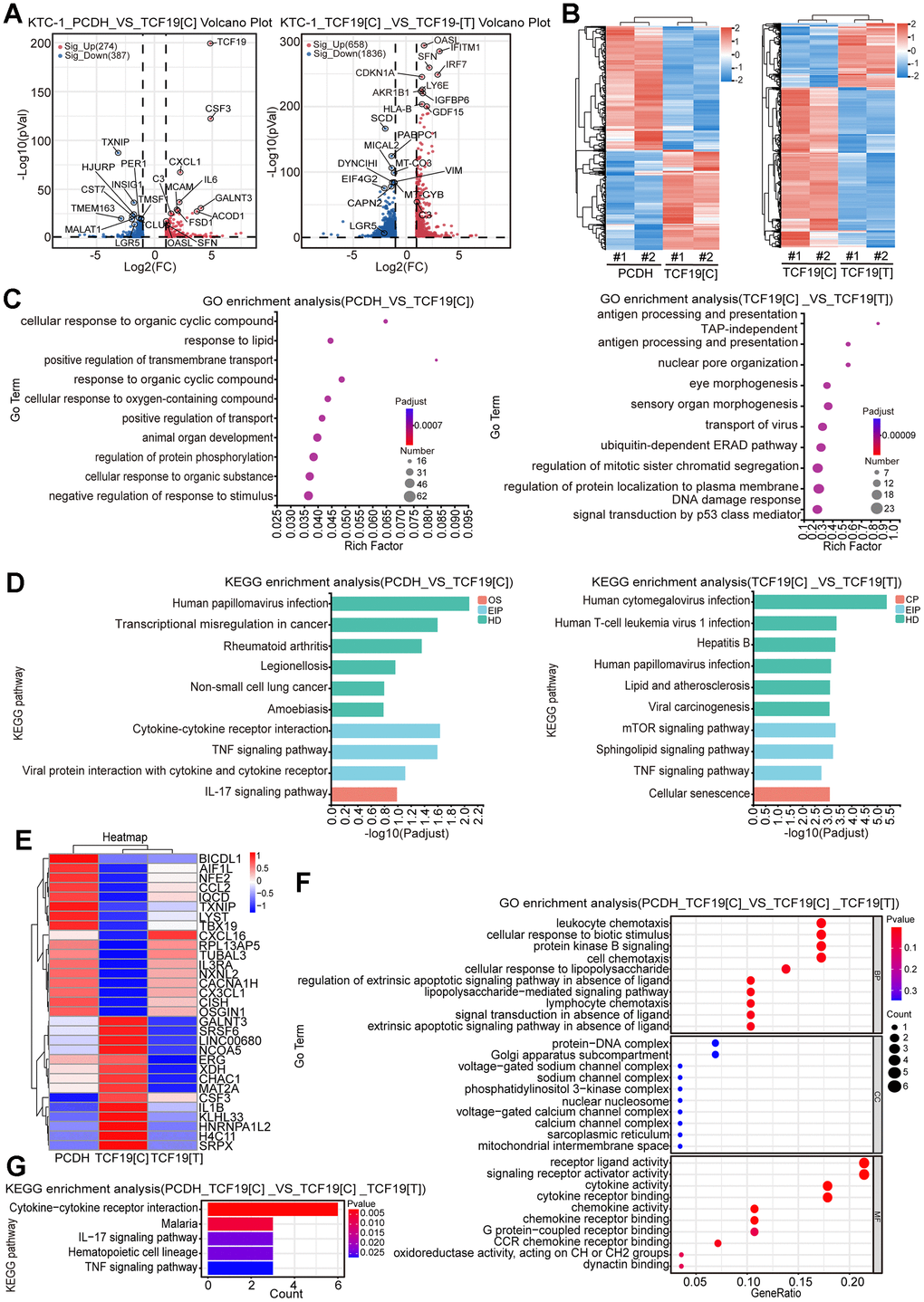 To identify the potential targets regulated by TCF19, RNA sequencing (RNA-seq) was performed in control, TCF19[C] and TCF19[T] overexpression cells. As shown in Supplementary Figure 5A, PCA analysis indicates that the different RNA-seq samples could be completely distinguished. Overexpression of TCF19[C] resulted in abnormal gene expression, with 339 upregulated genes and 424 downregulated genes. However, when TCF19[T] was overexpressed, a total of 723 genes were upregulated and 1865 genes were downregulated in these cells compared to TCF19[C]-overexpressing cells (Figure 3A, 3B). The results indicate that TCF19[C] and TCF19[T] affect the expression of many genes in thyroid cancer cells. GO and KEGG analyses showed that the differentially expressed genes (DEGs) were mainly enriched in cancer-related programs or signalling pathways, such as the TNF signalling pathway, IL-17 signalling pathway and cytokine-cytokine receptor interaction (Figure 3C, 3D). And then we found that there were 31 genes associated with SNP (Figure 3E and Supplementary Figure 5B). Additionally, GO and KEGG analyses revealed enrichment of signatures associated with signalling receptor activator activity, the IL-17 signalling pathway, and the TNF signalling pathway (Figure 3F, 3G). Based on these results, TCF19 appears to be a potent regulator of thyroid cancer progression, especially in regard to the inflammatory response. In addition, the SNP rs2073724 plays a crucial role in maintaining protein function.