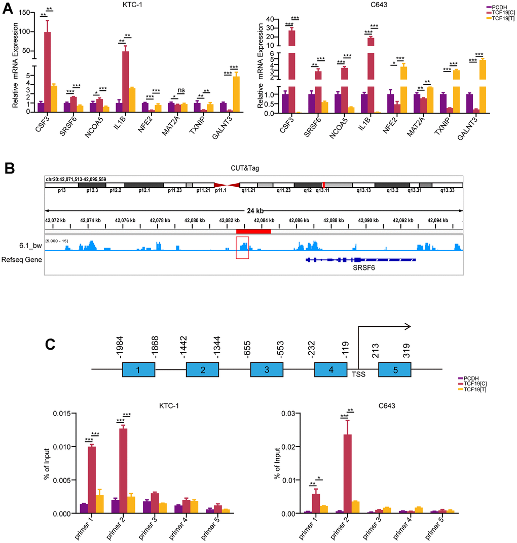 To further validate that the SNP mutation could abolish TCF19 protein function, we performed RT-PCR to detect the downstream genes of TCF19 from the RNA-seq. The results indicated that TCF19 could significantly regulate its target genes, while TCF19[T] partly abolished this function (Figure 4A). To further stress this interesting question, we analysed the SNP mutation site of the protein. We found that the SNP mutation site was located in the proline-rich region of TCF19 (Supplementary Figure 7A, 7B). A previous study indicated that TCF19 contains a proline-rich region, which is a common characteristic of transactivating factors [20]. We noticed that the SNP was located in the proline-rich region of the TCF19 protein. Therefore, we hypothesized that the SNP mutation affects the transactivating ability of TCF19. Then, we analysed our unpublished CUT&Tag data for TCF19 and found that TCF19 could directly bind to the promoter of the SRSF6 gene (Figure 4B). To further verify whether TCF19 activates the SRSF6 promoter through direct binding, we performed chromatin immunoprecipitation (ChIP) assays. As expected, TCF19 was recruited to the promoter sites. However, TCF19[T] strongly reduced the binding ability at the promoter of SRSF6 (Figure 4C). Taken together, TCF19 may be an exciting new therapeutic target for aggressive thyroid cancer. The alternative allele of the rs2073724 variant disrupts the oncogenic functions of TCF19, implicating the rs2073724 C>T variant as a causal genetic variant influencing thyroid cancer risk.