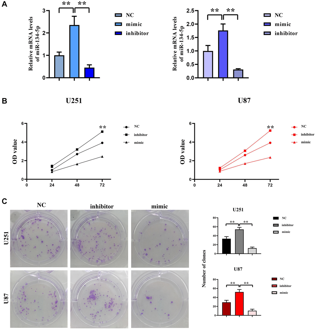 To elucidate the function of hsa-miR-134-5p in gliomas, both U251 and U87 cell lines were subjected to transfection with hsa-miR-134-5p mimics to augment the intracellular concentration of hsa-miR-134-5p, and conversely, its expression was mitigated through the application of hsa-miR-134-5p inhibitors. Post-transfection RT-qPCR analyses authenticated a marked upregulation of hsa-miR-134-5p in cells receiving miR-134-5p mimics, contrarily, a significant depression in expression was observed in cells administered with the hsa-miR-134-5p inhibitor, as presented in Figure 1A.