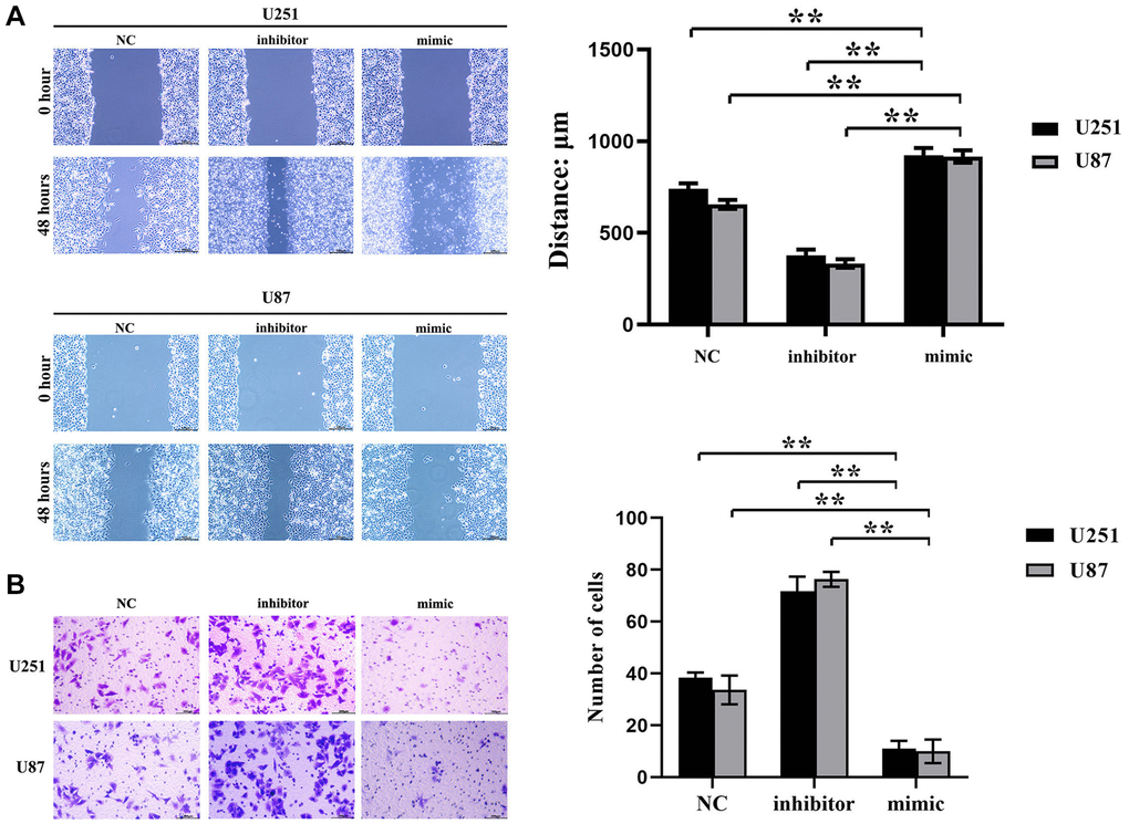 Cell scratch experiments exhibited that the induction of hsa-miR-134-5p mimics resulted in a considerable decrement of both migration distance and wound healing rate of U251 and U87 cells vis-à-vis the negative control (NC) group as showcased in Figure 2A. Moreover, hsa-miR-134-5p antagonism propelled an increase in both metrics. Accompanying Transwell invasion assays further substantiated a diminished cell invasion presence in hsa-miR-134-5p mimic-treated cells, as opposed to an elevated passage density in cells treated with the hsa-miR-134-5p inhibitor, amalgamating to denote the migration and invasion suppression properties of hsa-miR-134-5p in the evaluated glioma cells (Figure 2B).