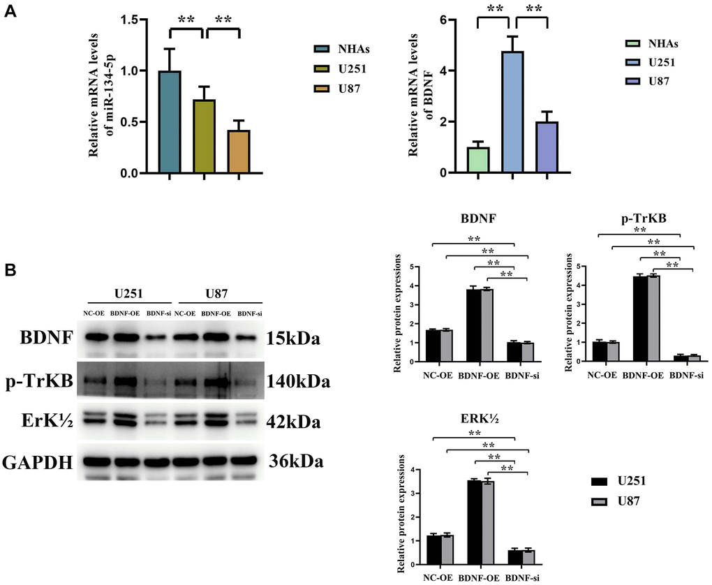 Glioblastoma cell lines U251 and U87 were inoculated in DMEM medium containing fetal bovine serum (Dulbecco’s modified Eagle medium) and routinely cultured at 37°C under 5% CO2. Normal human astrocytes (NHAs) were purchased from ScienCell Research Laboratories, Inc. (San Diego, CA, USA) and cultured in the astrocyte medium (ScienCell Research Laboratories, Inc.). Both hsa-miR-134-5p mimic and hsa-miR-134-5p inhibitor, pcDNA3.1 plasmid vector BDNF-OE, and BDNF-NC were synthesized by Shanghai Sangon Biotech (Shanghai, China). Hsa-miR-134-5p primer design and synthesis (Shanghai Sangon Biotech Co., Ltd.). MEM medium (Gibco, USA: 42360032). Fetal bovine serum (Gibco: 10099-141). Dual antibody (Gibco: 15140-122). Trypsin solution (Gibco: 25200-056). Lipofectamine 3000 (Invitrogen, USA: L3000001). TRIzol (Invitrogen: 15596026). PrimeScript RT Master Mix (TaKaRa, Japan: RR036A). TB Green Premix Ex Taq (TaKaRa: RR420A). BCA protein concentration assay kit (Beyotime, China: P0012). CyclinD1 (Abcam, UK: ab16663). CyclinA2 (Abcam: ab181591). MMP2 (Abcam: ab92536). MMP9 (Abcam: ab76003). BDNF (Abcam: ab108319). p-TrkB (Abcam: ab229908). p-ERK1/2 (Abcam: ab184669). t-ERK1/2 (Abcam: ab17942). GAPDH (Abcam: ab8245). Goat anti-mouse secondary antibody (Abcam: ab97080) constant temperature and humidity cell incubator (Thermo Fisher Scientific, USA: Form371). Transwell Chamber (BD Company, USA). Velocity 18R Pro multi-functional desktop high-speed refrigerated centrifuge (Techcomp Laboratory Equipment (Shanghai) Co., Ltd., China). Azure C300 chemiluminescence imaging system (Shanghai Dowsontec Industrial Co., Ltd., China). Mini-Protean Tetra small vertical electrophoresis tank 165-8001 electrophoresis apparatus (Bio-Rad, USA).