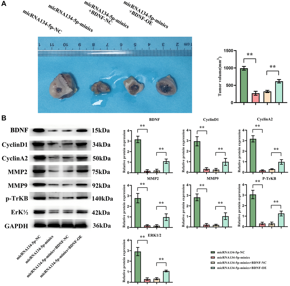 Finally, to substantiate the in vivo tumoricidal effect of hsa-miR-134-5p, a BALB/c xenograft model was established employing U251 cells in nude mice, as delineated in the Methods. Observations distilled from this model tipped the scales towards a tangible diminution in tumor volume in subjects from both the miR134-mimics and miR134-mimics plus BDNF-NC groups vis-a-vis the NC group, the latter receiving an upswing in tumor volume post-treatment (Figure 5A). Western blot inspections correspondingly disclosed heightened expressions of BDNF, cyclin D1, cyclin A2, MMP2/9, p-TrKB, and ERK1/2 in the former groups, pinpointing a surge in the said proteins within the miR134-mimics plus BDNF-OE group (Figure 5B).